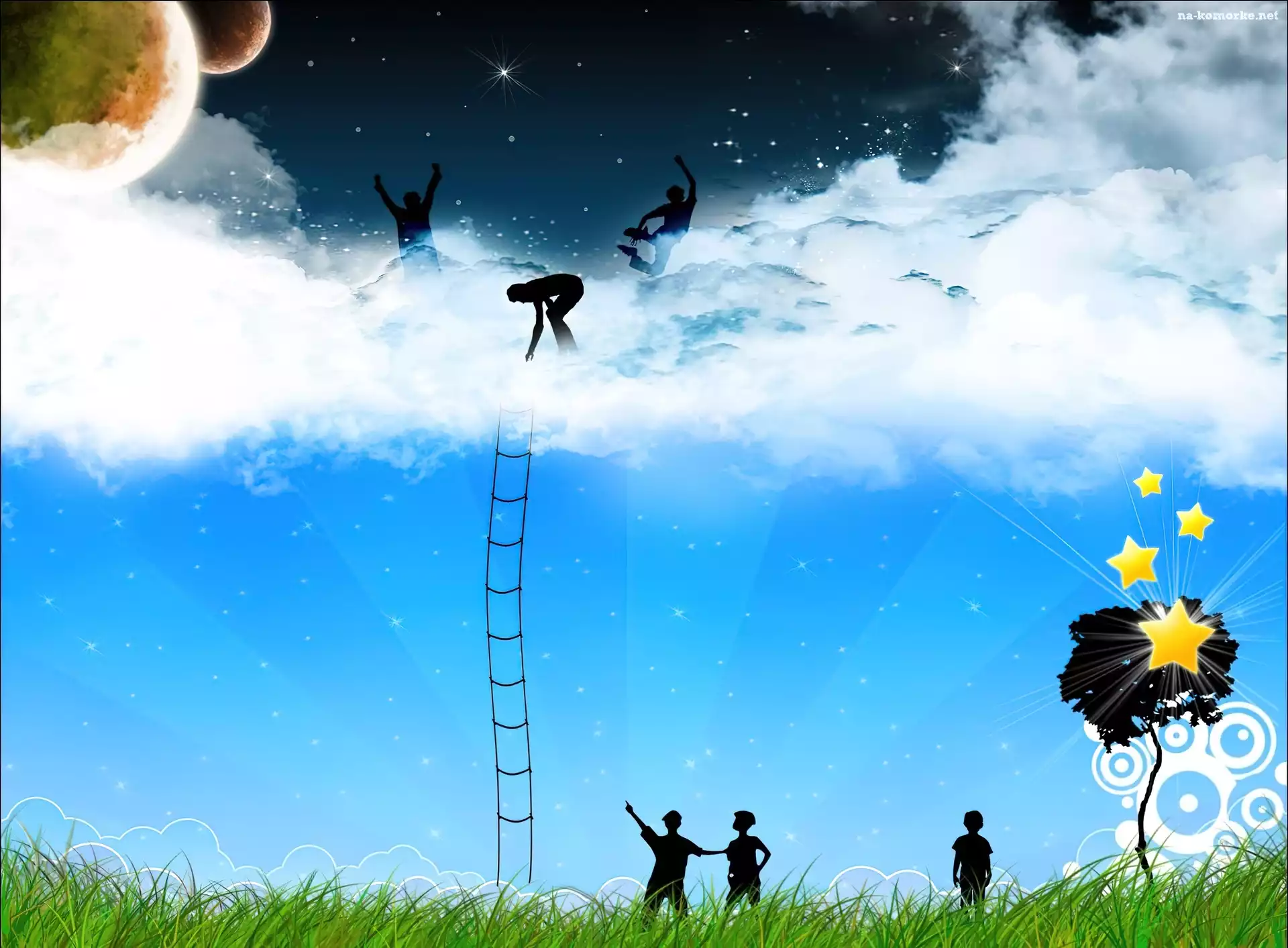 Niebo, Łąka, Drzewo, Dzieci, Drabina na Komórkę