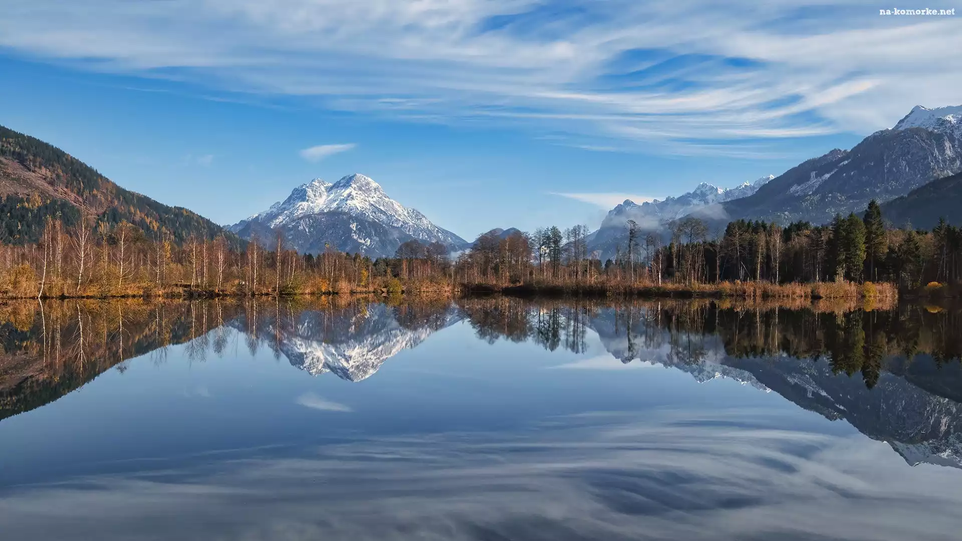 Odbicie, Jesień, Drzewa, Niebo, Jezioro, Góry na Komórkę