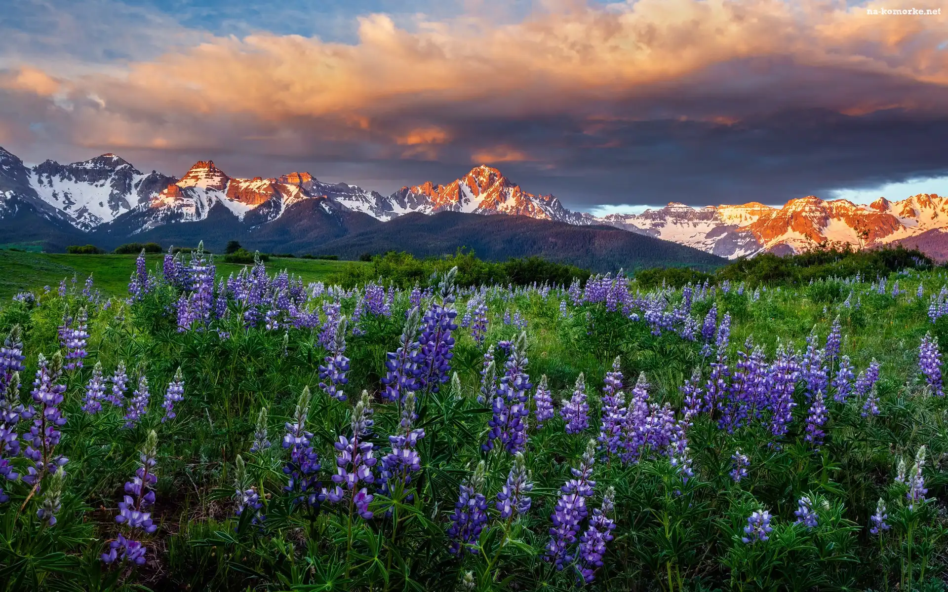 Chmury, Góry, Polana, Niebo, Łubin, Kwiaty na Komórkę