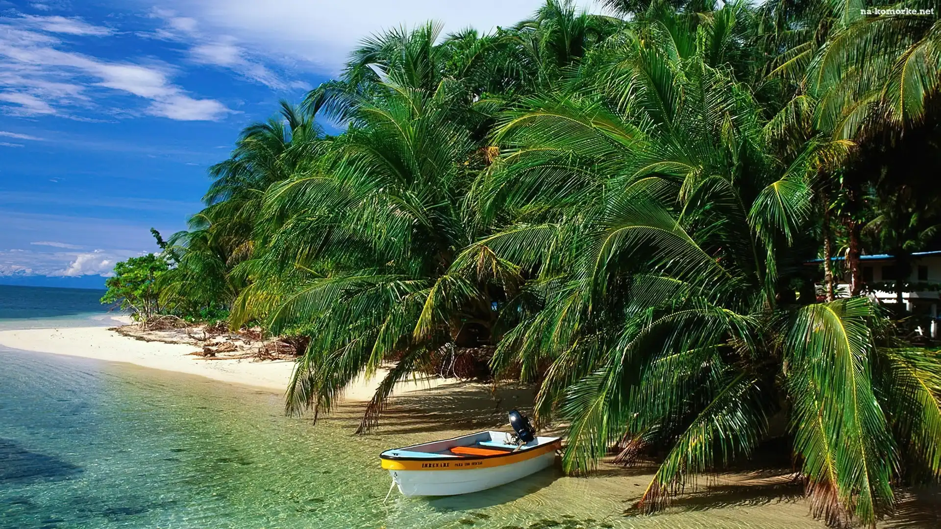 Niebo, Łódka, Morze, Palmy na Komórkę