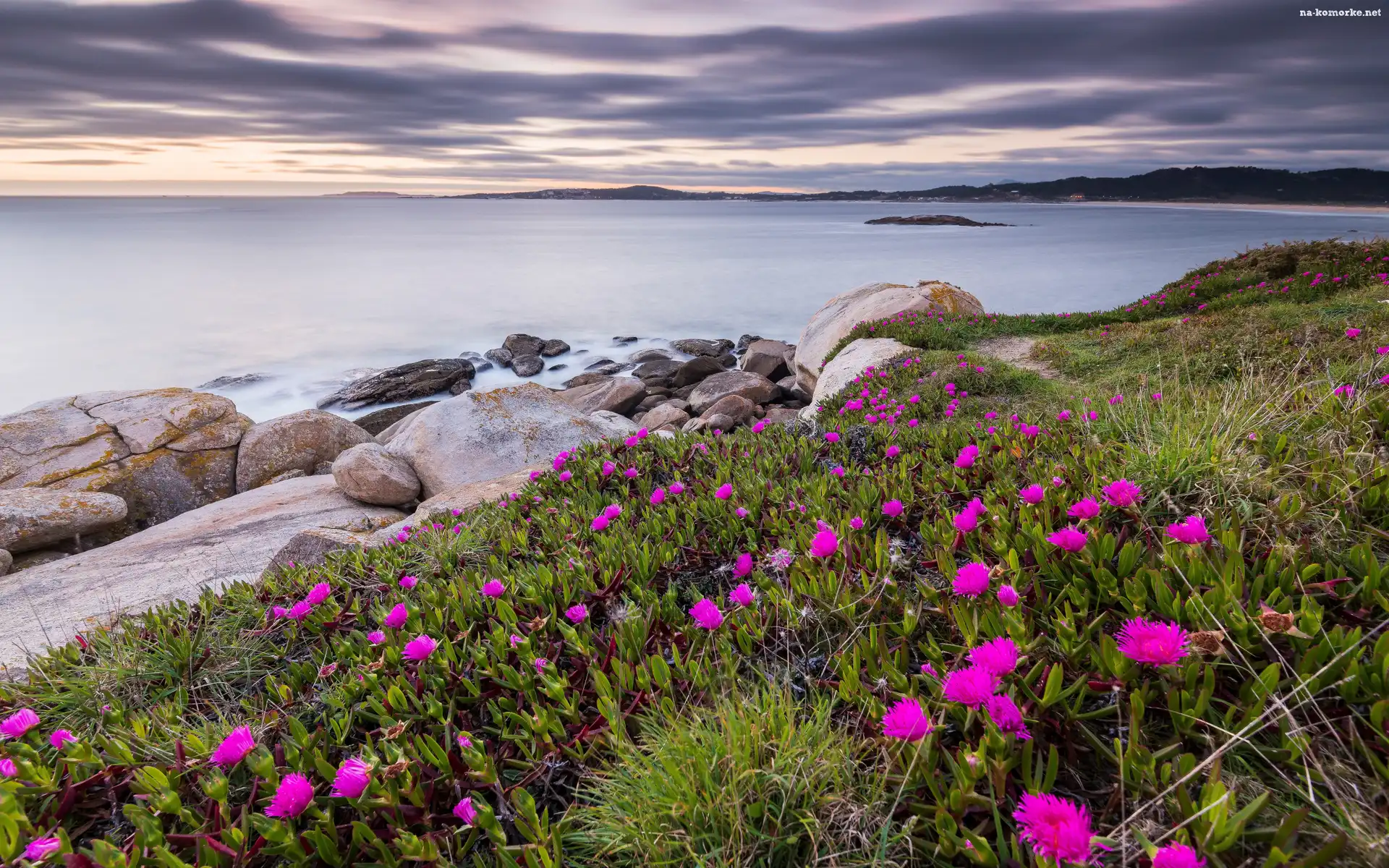Różowe, Niebo, Skały, Chmury, Kwiaty, Kamienie, Wybrzeże, Morze na Komórkę