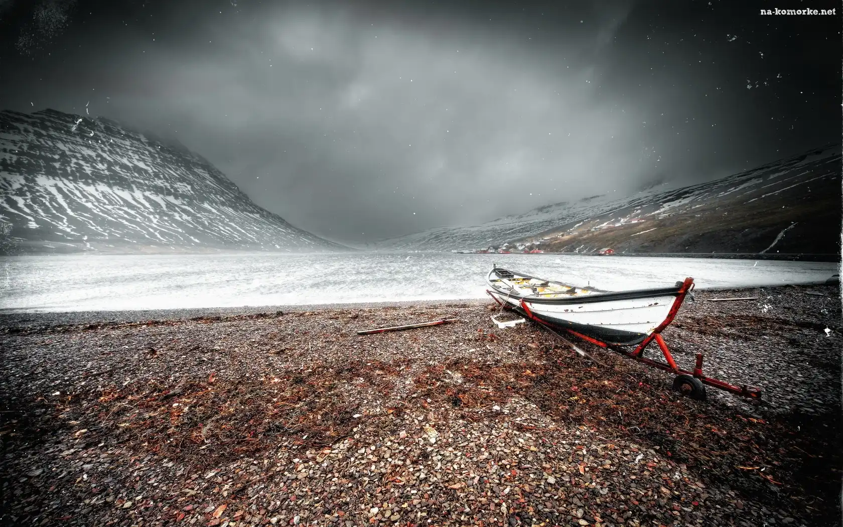 Niebo, Góry, Jezioro, Łódka, Zachmurzone na Komórkę