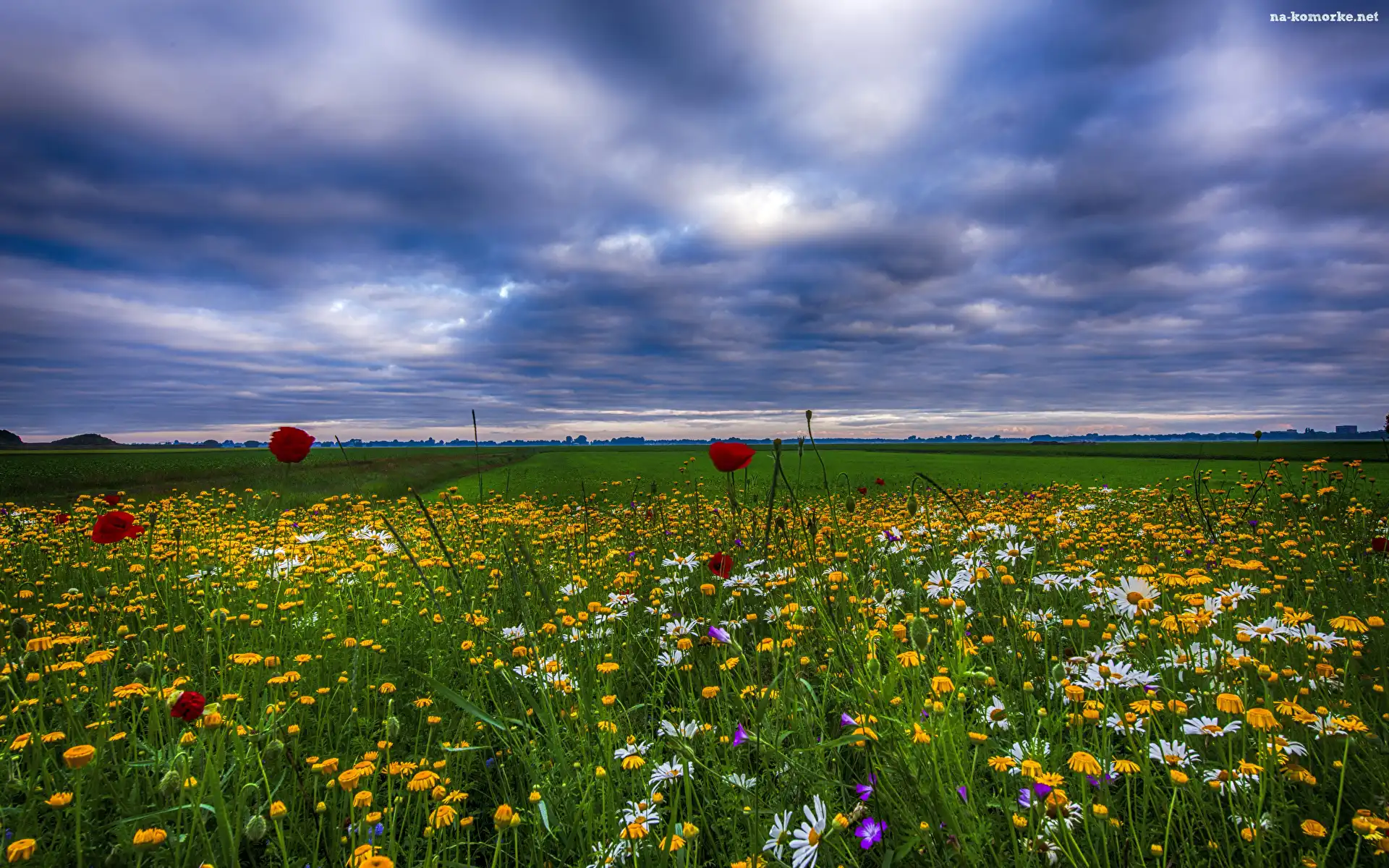 Pole, Niebo, Chmury, Łąka, Kwiaty, Maki, Rumianki na Komórkę