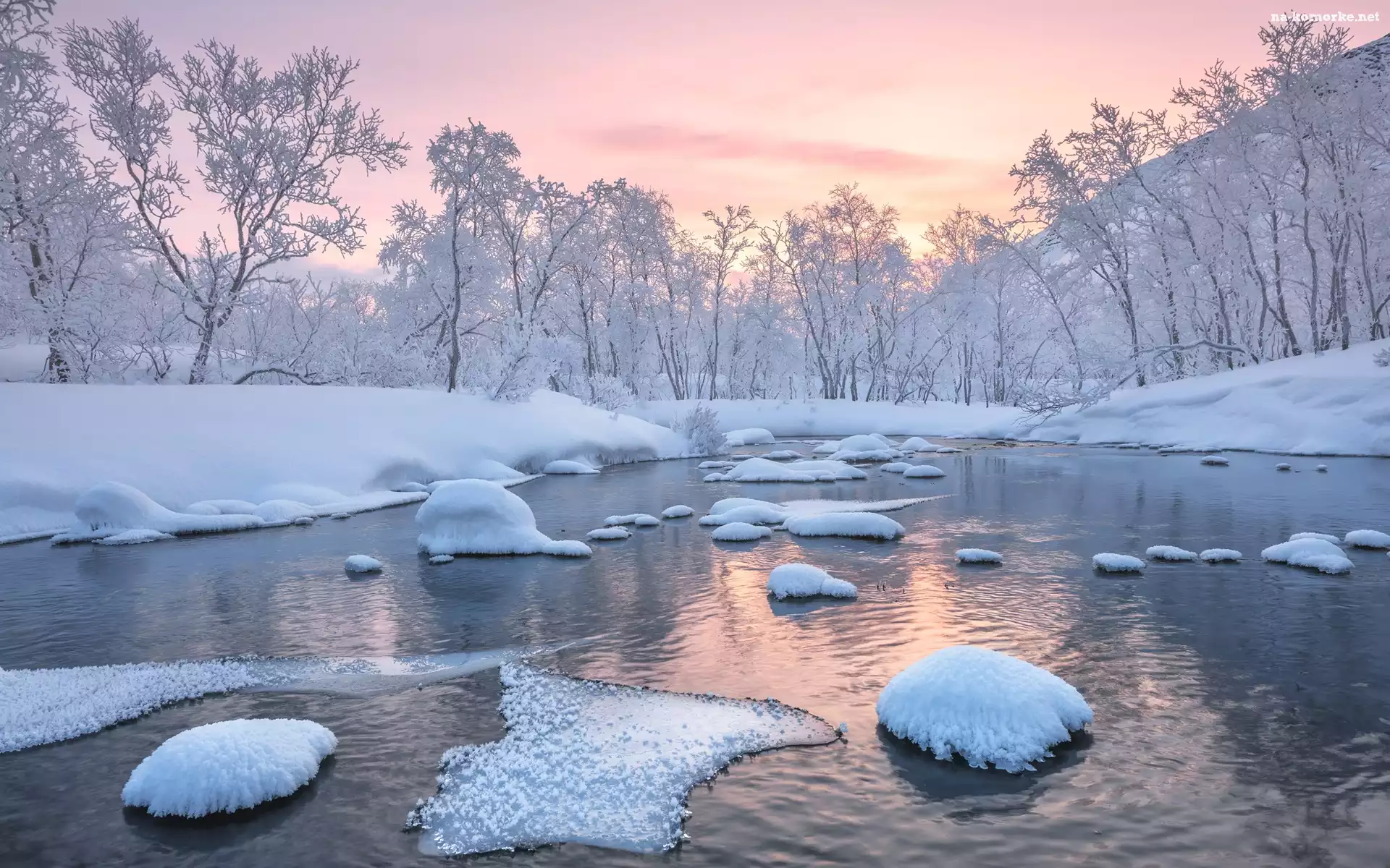 Różowe, Zima, Drzewa, Niebo, Ośnieżone, Rzeka na Komórkę