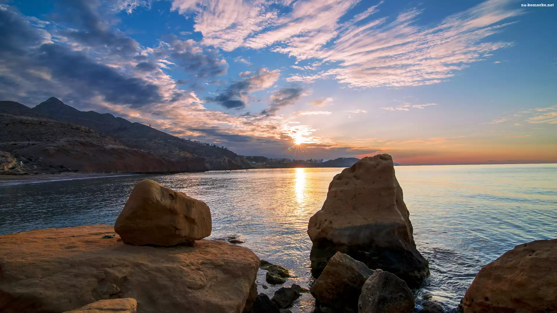 Niebo, Morze, Zachód słońca, Skały, Chmury na Komórkę