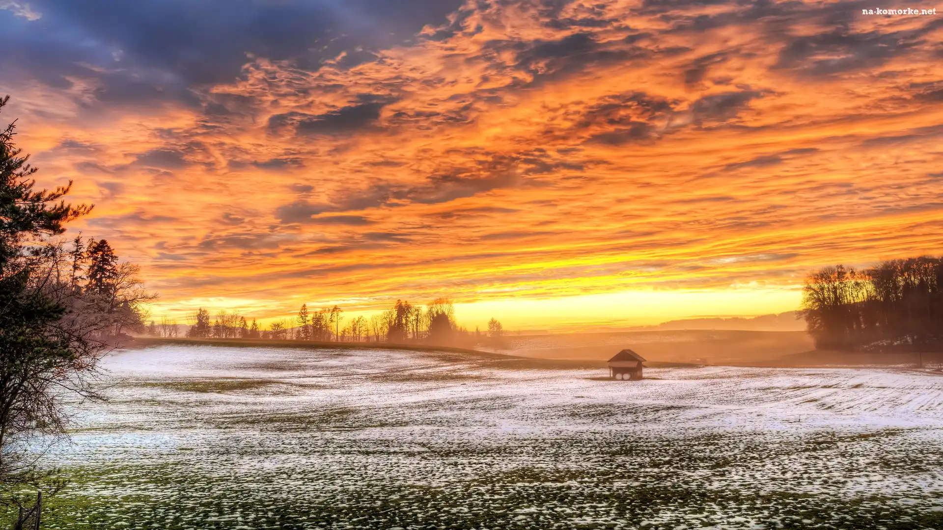 Niebo, Pole, Zima, Zachód słońca, Drzewa na Komórkę
