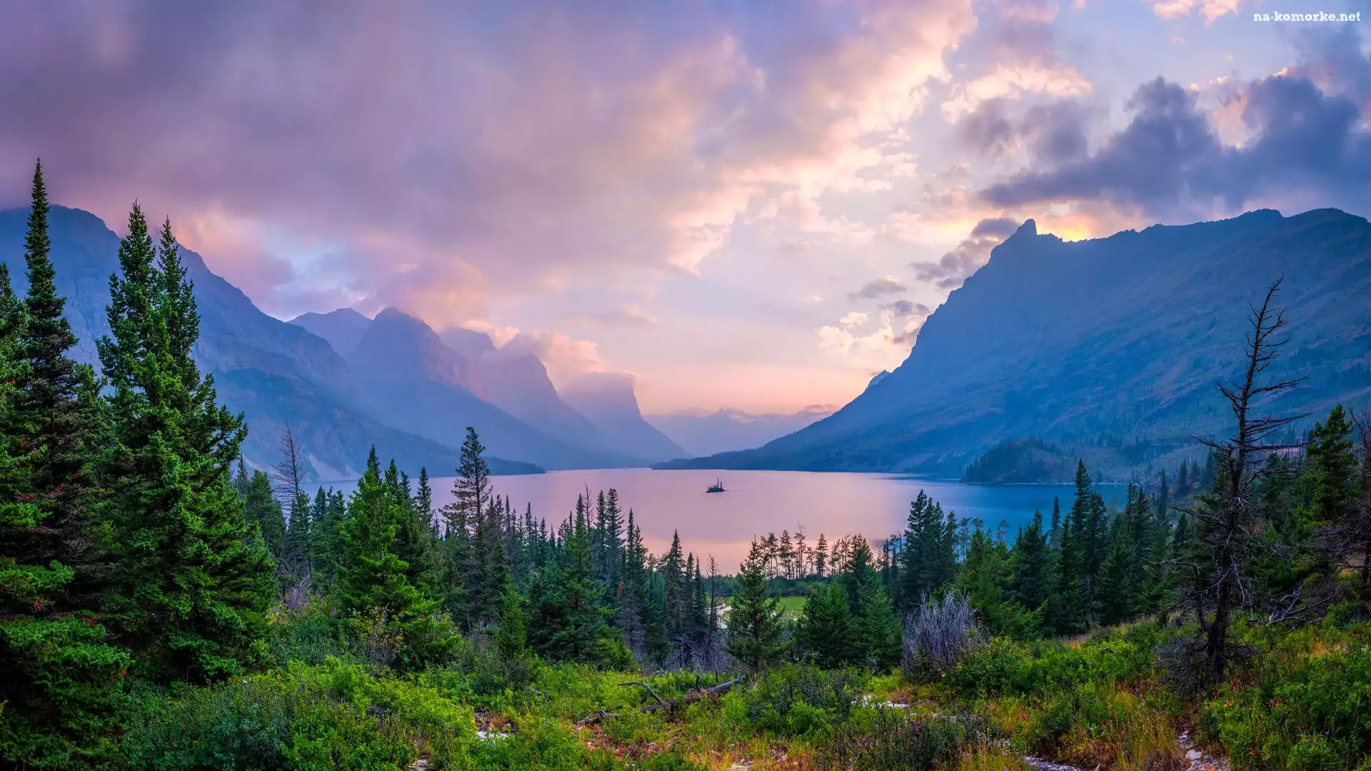 Saint Mary Lake, Niebo, Drzewa, Park Narodowy Glacier, Krzewy, Stany Zjednoczone, Góry, Jezioro na Komórkę |