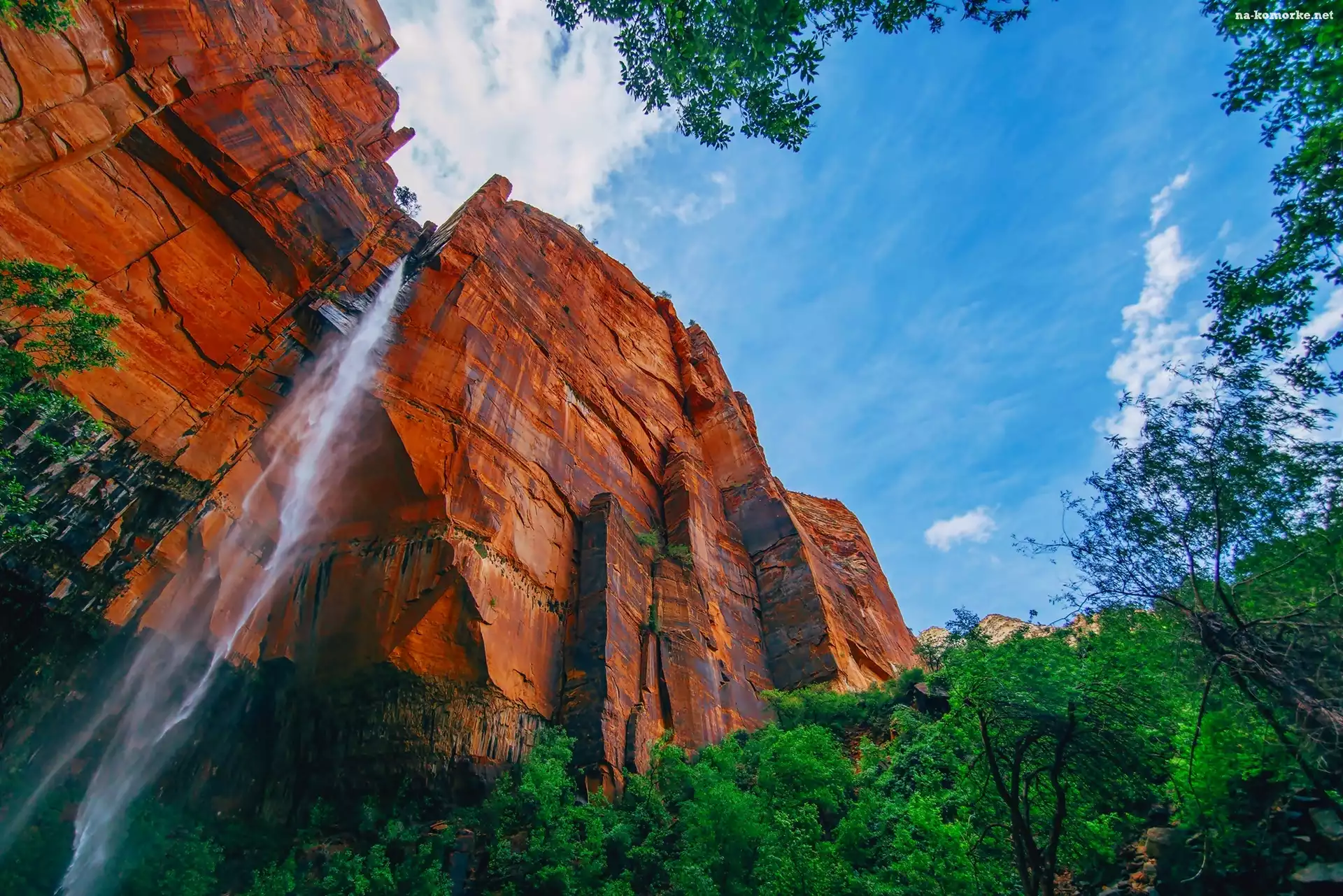 Niebo, Kanion, Skały, Wodospad, Drzewa na Komórkę