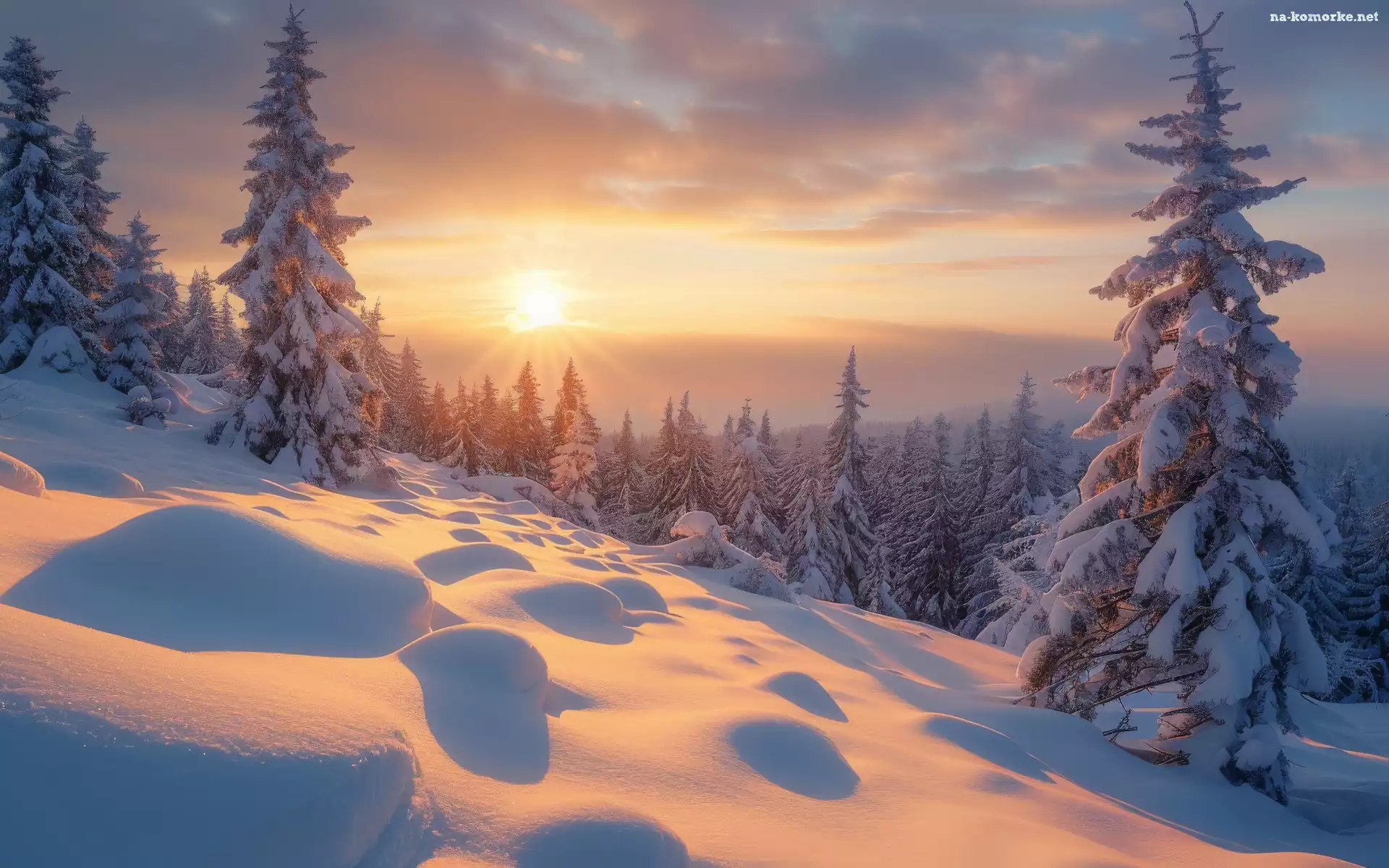 Niebo, Zaspa, Wschód słońca, Śnieg, Drzewo, Las, Zima, Wzgórze, Poranek na Komórkę