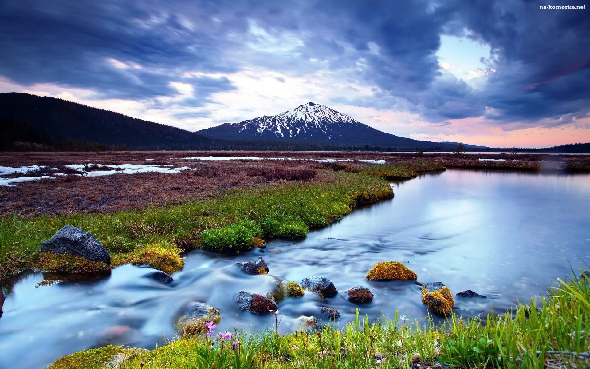 Niebo, Lasy, Góry, Woda, Zachmurzone, Kamienie na Komórkę