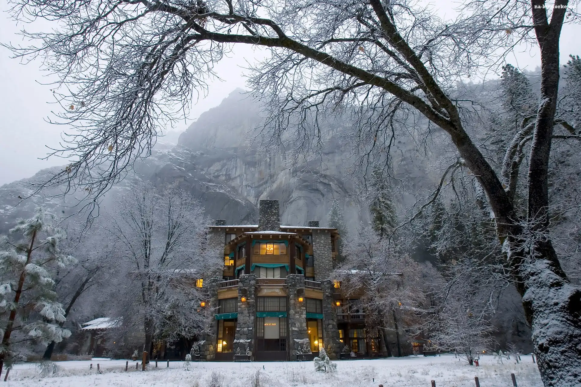 Śnieg, Zima, Góry , Drzewa, Dom, Światło na Komórkę