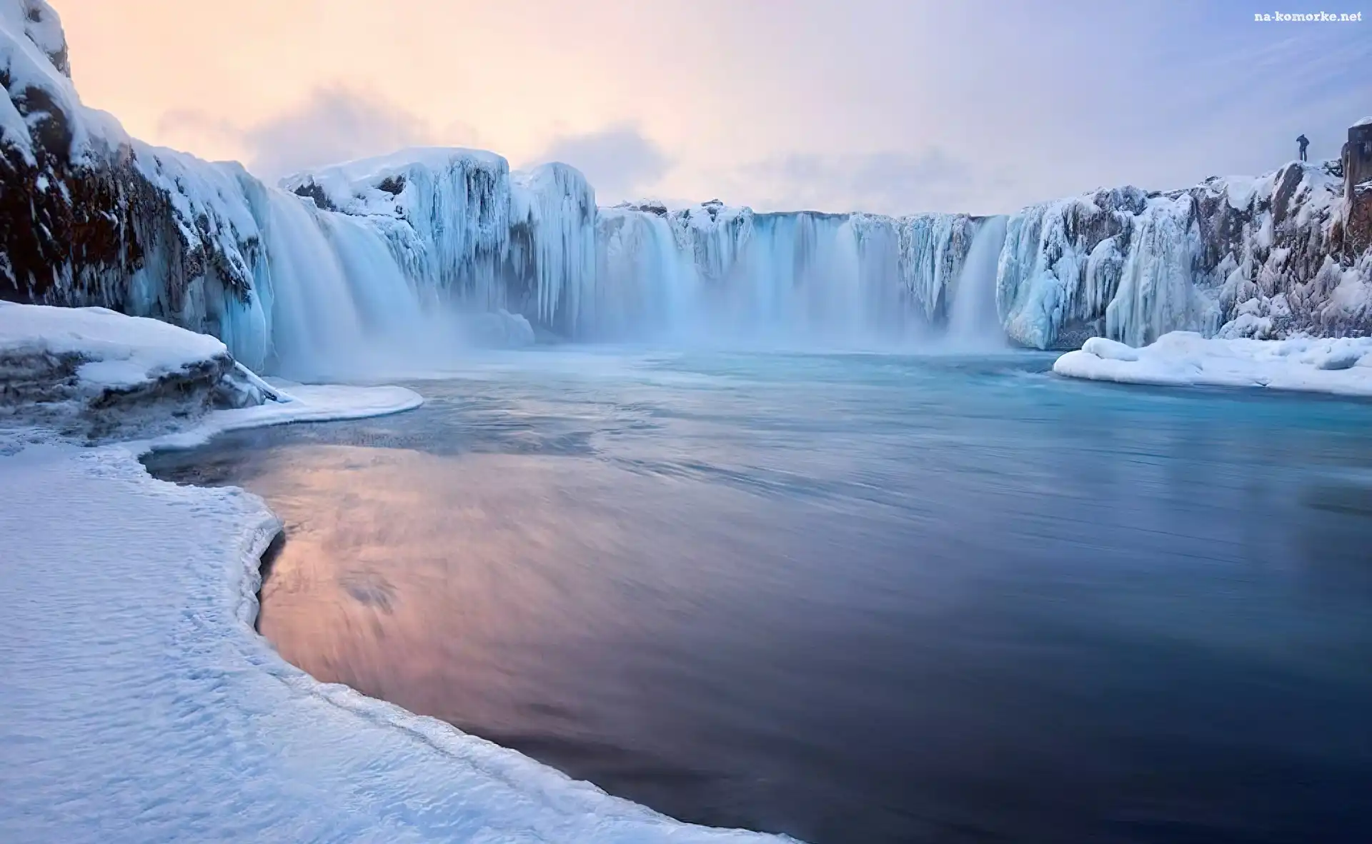 Śnieg, Rzeka, Wodospad Godafoss, Islandia, Zima na Komórkę