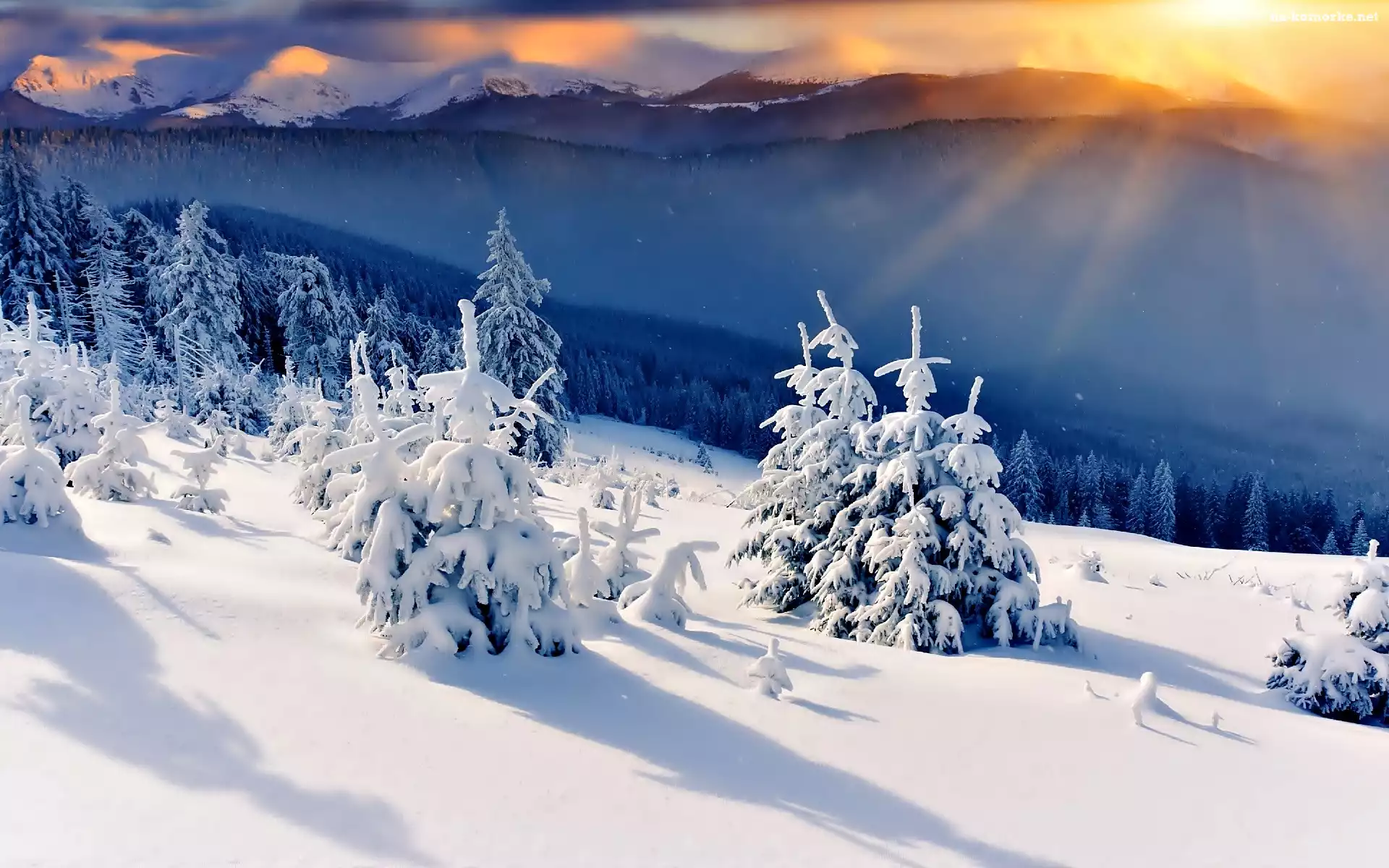 Góry, Śnieg, Zima, Dolina, Drzewa, Zachód Słońca na Komórkę