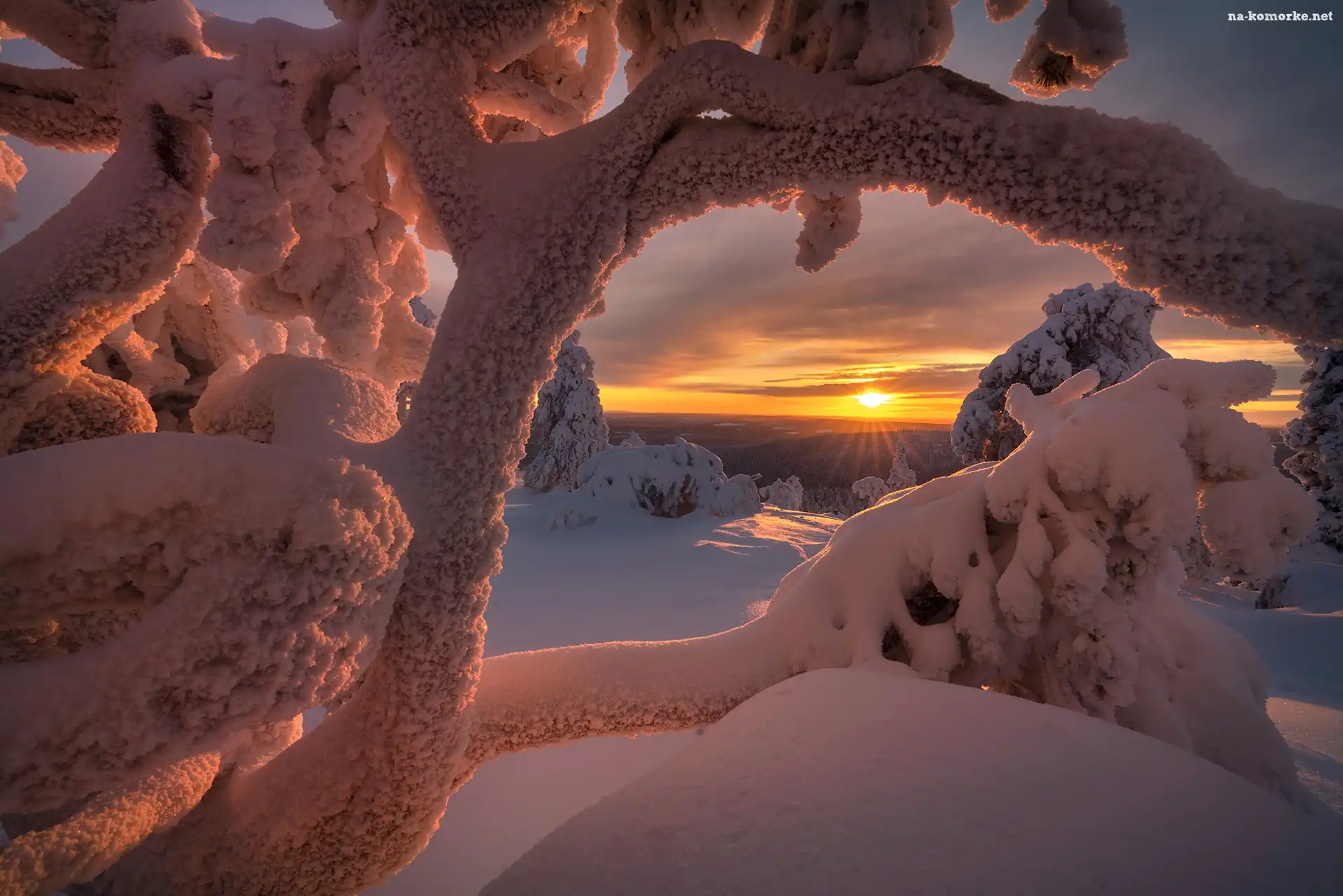 Szron, Śnieg, Zima, Konary, Promienie słońca, Drzewa na Komórkę