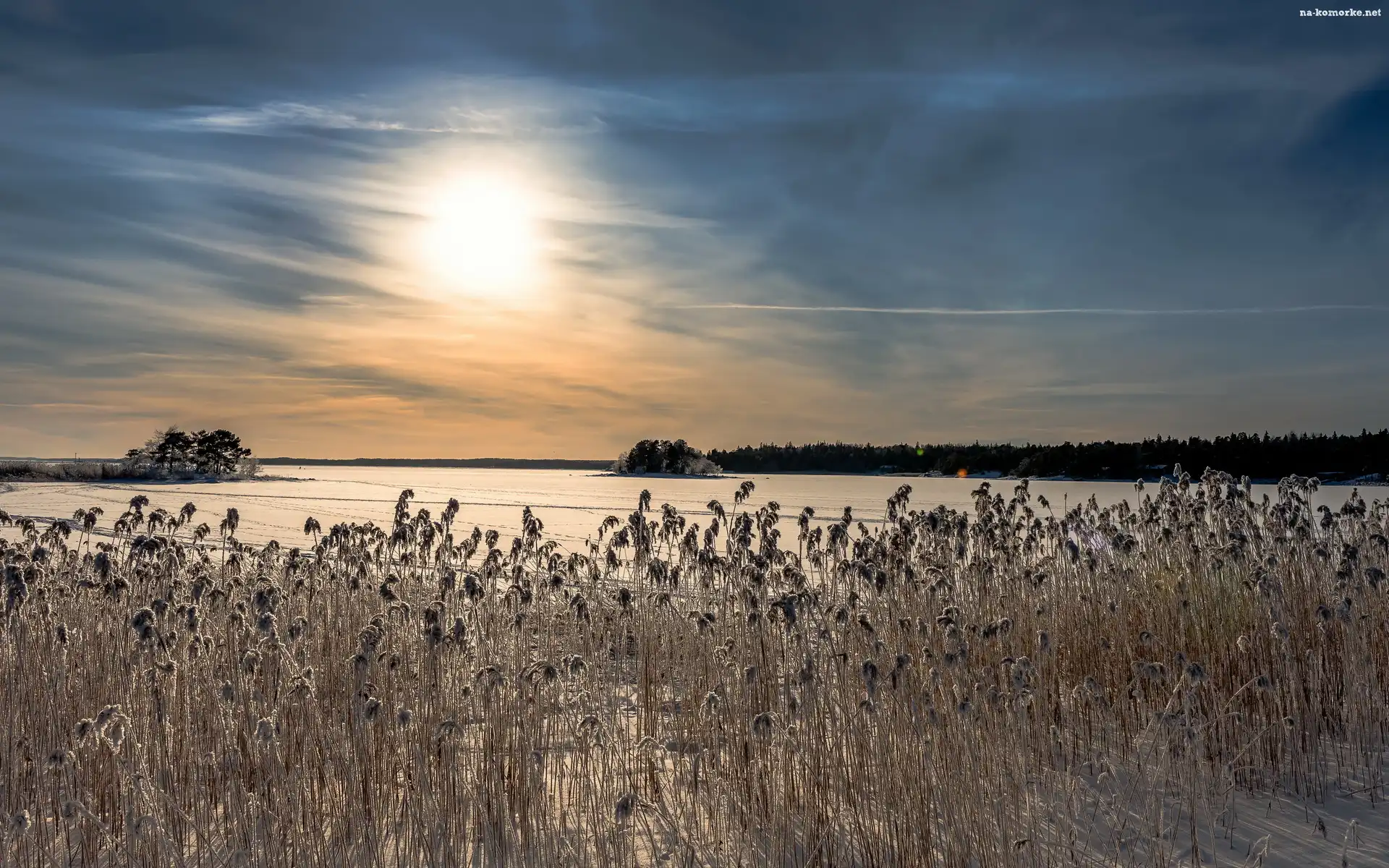 Śnieg, Wschód słońca, Zima, Rośliny, Pola, Uschnięte na Komórkę