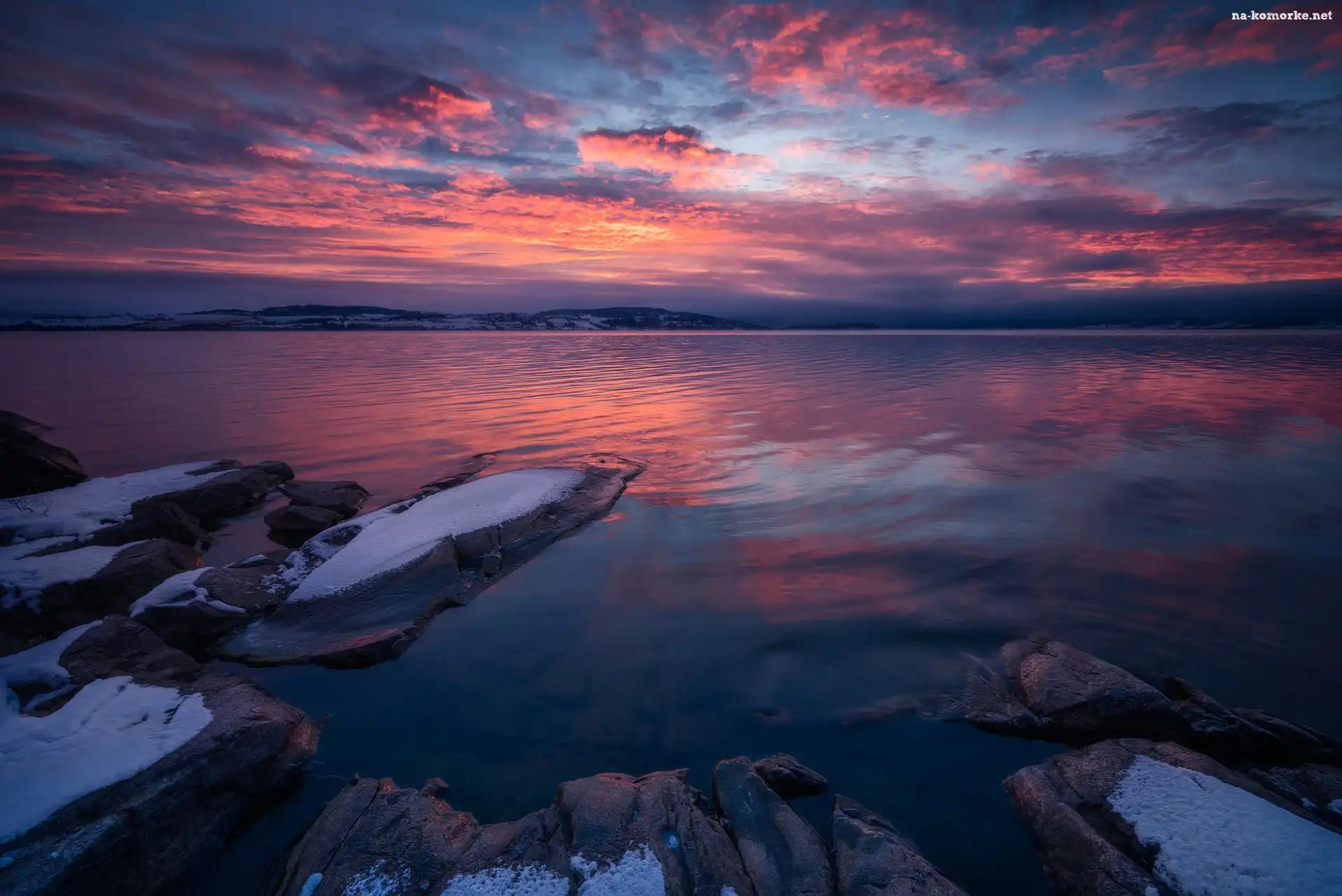 Norwegia, Chmury, Wschód słońca, Jezioro Tyrifjorden, Kamienie, Zima, Śnieg na Komórkę