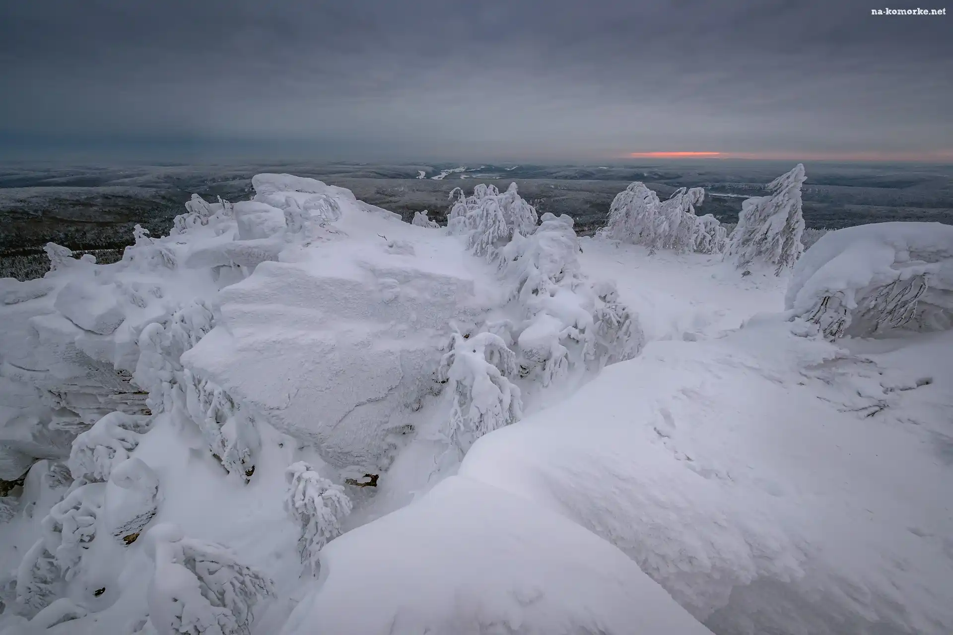 Zaśnieżone, Śnieg, Zima, Drzewa, Wschód słońca, Skały na Komórkę