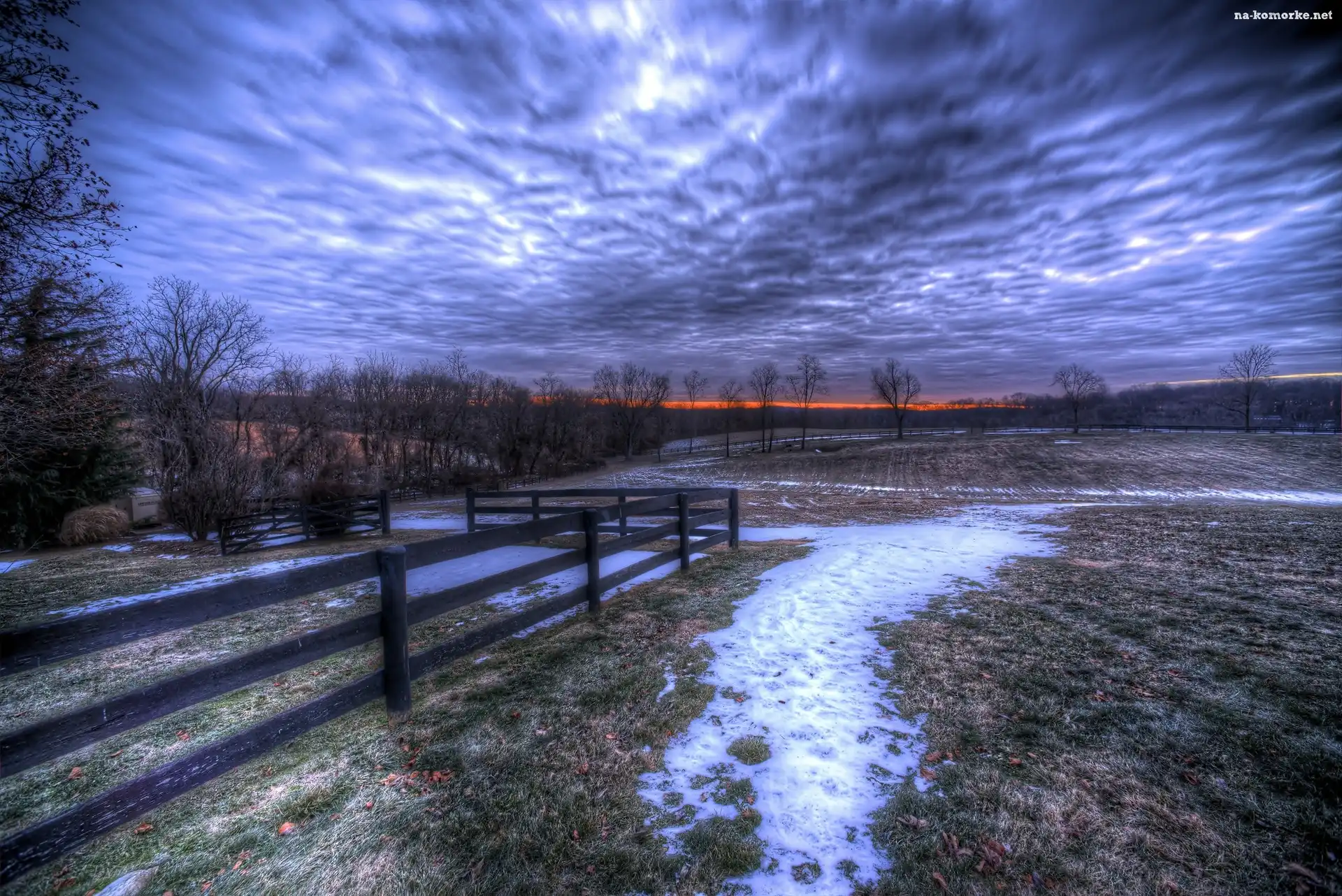 Łąka, Zima, Chmury, Śnieg, Ogrodzenie na Komórkę