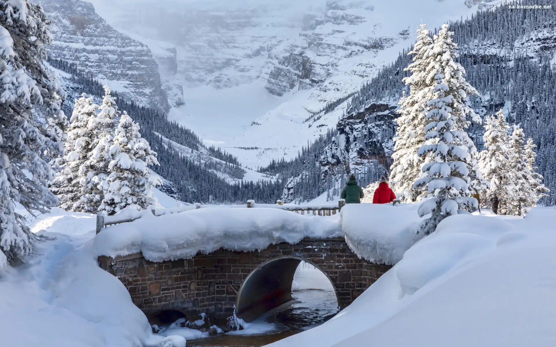 Zima, Śnieg, Ludzie, Góry, Ośnieżone, Drzewa, Most na Komórkę