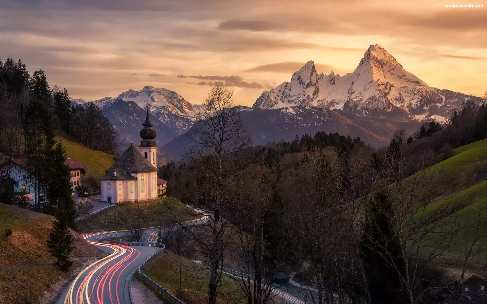 Drzewa, Kościół, Alpy Salzburskie, Droga, Niemcy, Sanktuarium Maria Gern, Bawaria, Góry, Berchtesgaden na Komórkę |