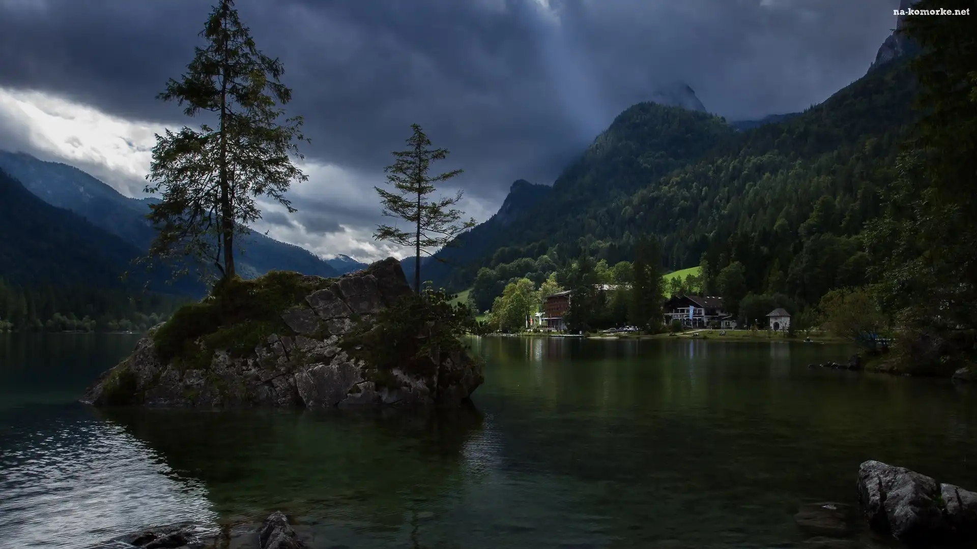 Domy, Drzewa, Góry, Niemcy, Hintersee, Skały, Jezioro na Komórkę