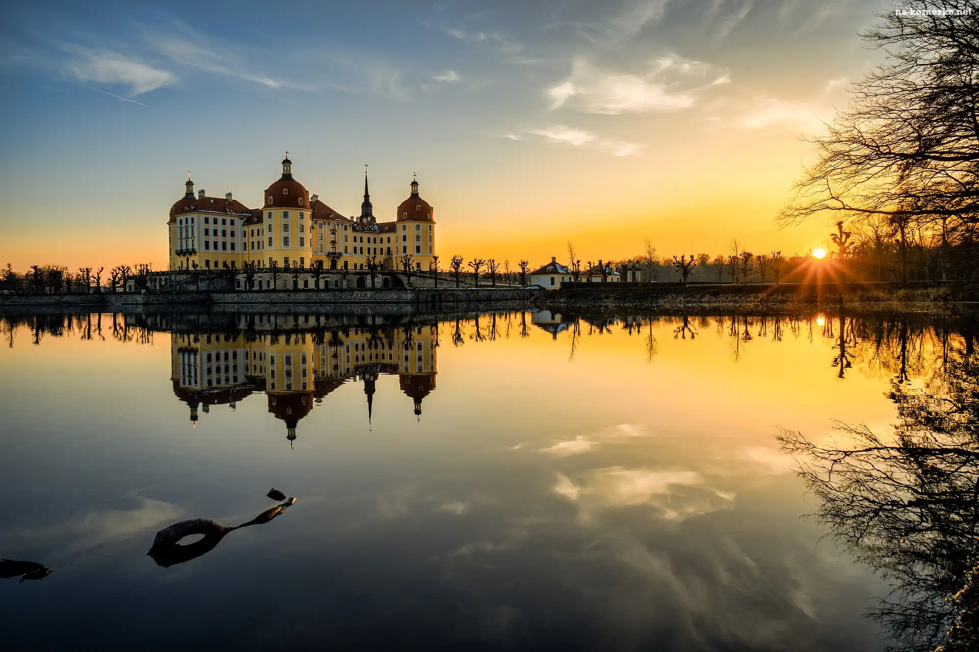 Niemcy, Pałac Moritzburg, Drezno, Zachód słońca, Saksonia, Jezioro Waldsee na Komórkę