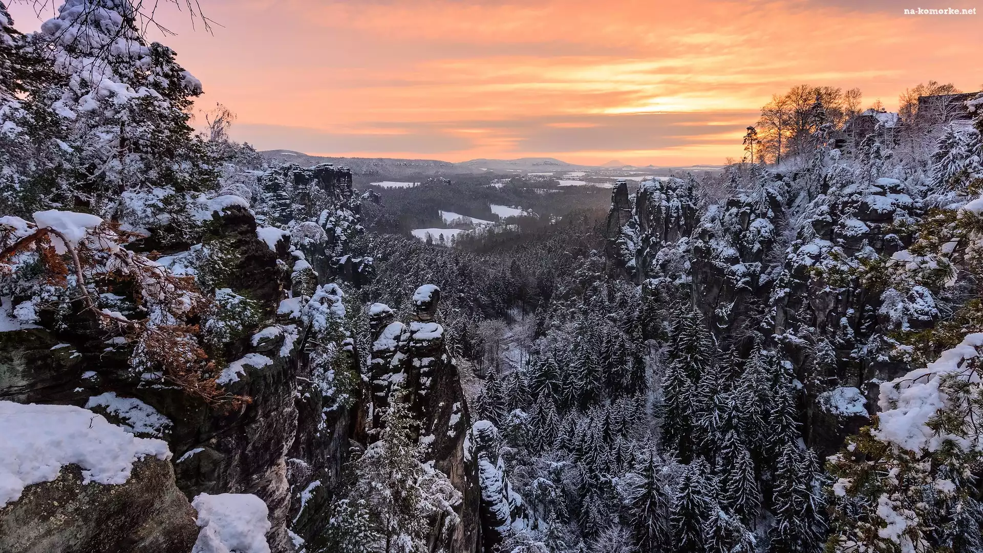 Zima, Park Narodowy Saskiej Szwajcarii, Niemcy, Skały, Góry Połabskie, Drzewa, Zachód słońca na Komórkę |