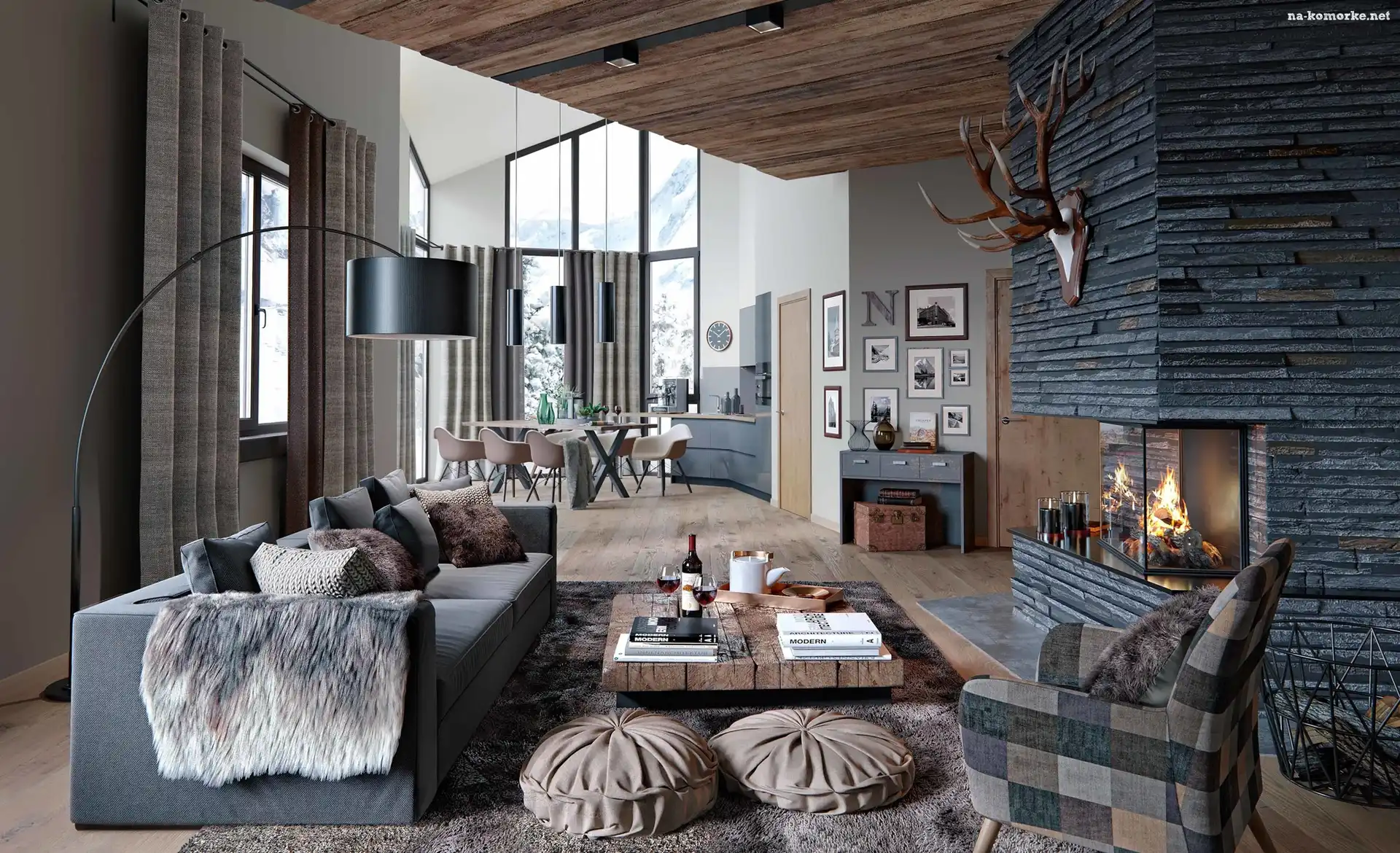 Salon, Niski, Stolik, Kominek, Fotel, Kanapa, Lampa na Komórkę