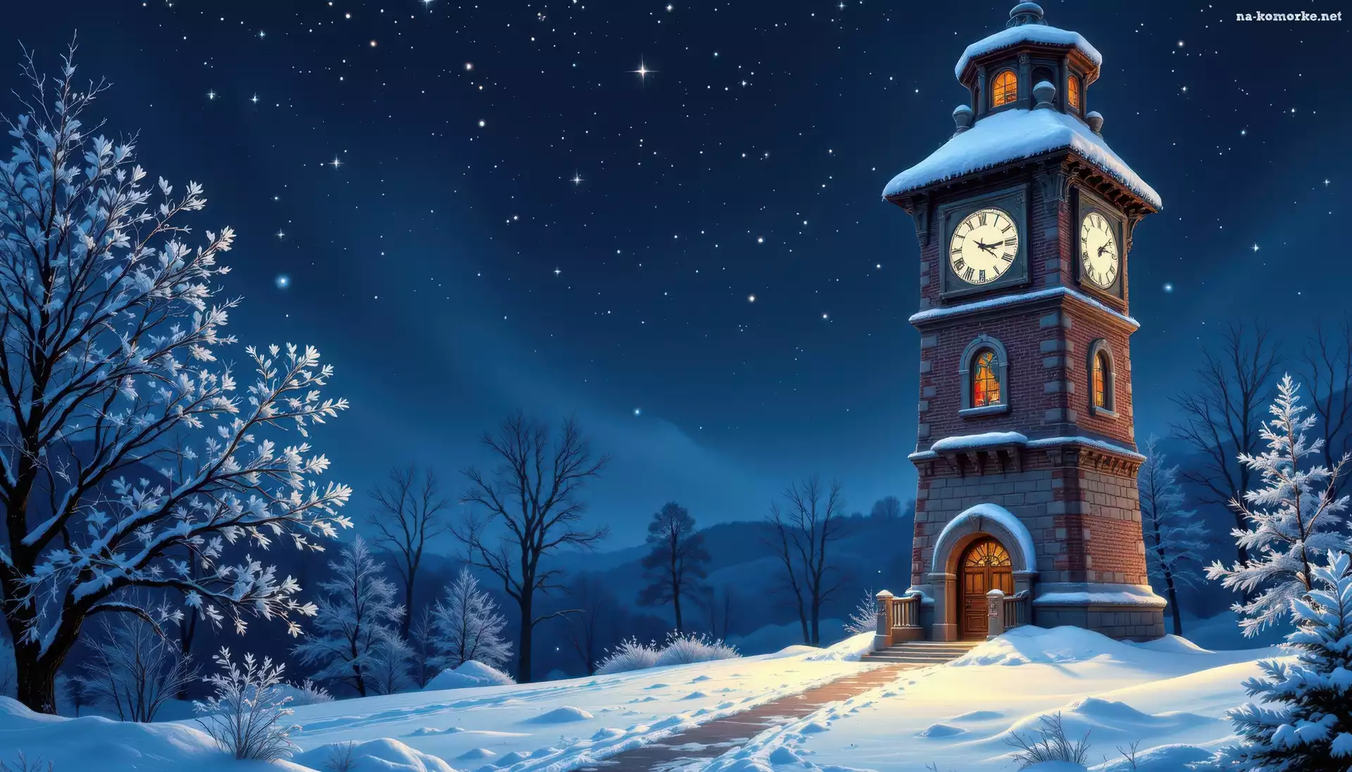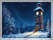 Zegar, Zima, Droga, Noc, Wieża, Drzewa na Komórkę