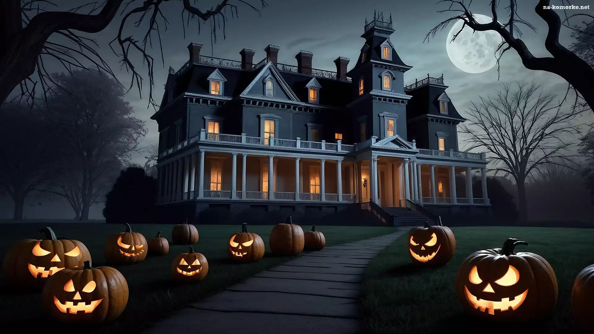 Dom, Drzewa, Dynie, Halloween, Droga, Księżyc, Świecące, Noc na Komórkę