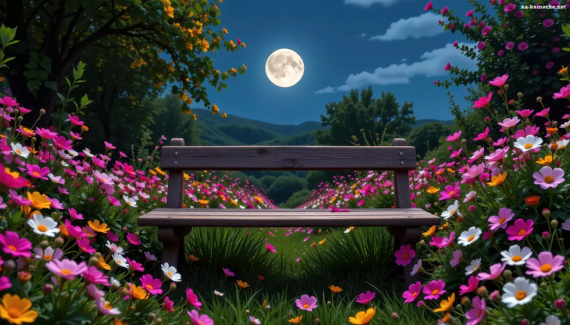 Ławka, Noc, Księżyc, Kwiaty, AI na Komórkę