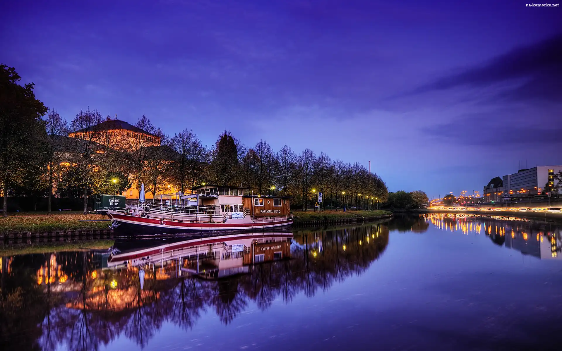 Noc, Rzeka, Statek, Latarnie, Miasto na Komórkę