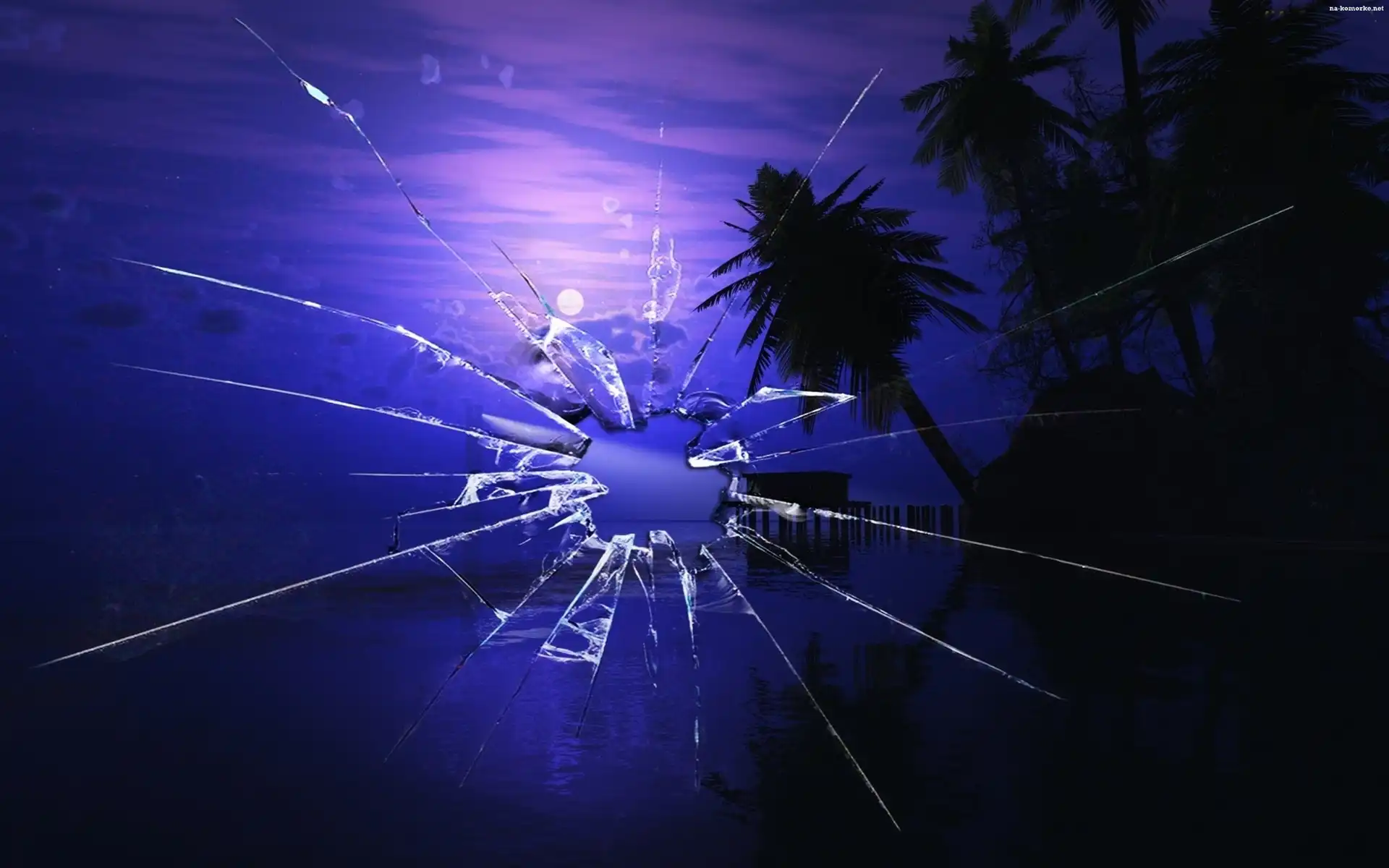 Noc, Morze, Palmy, Pęknięty, Ekran na Komórkę