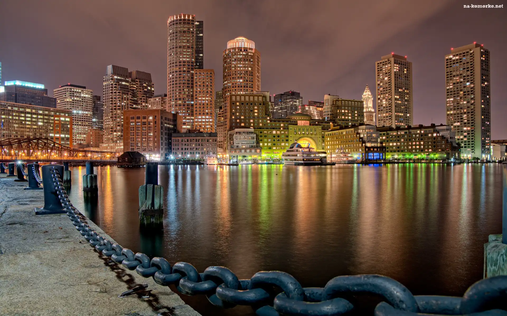 Noc, Misto, Panorama, Boston, Port, Światła na Komórkę