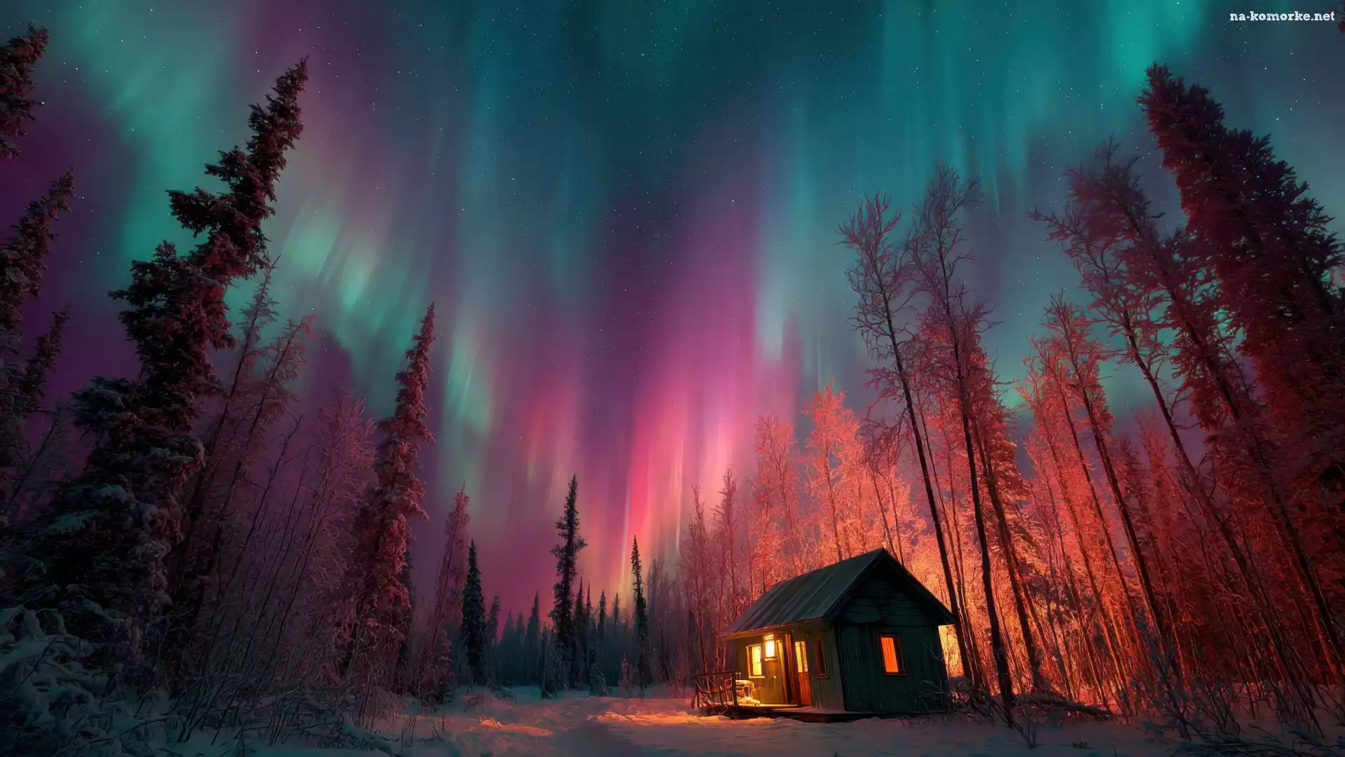 Drzewa, Oświetlony, Zorza polarna, Dom, Zima, Ośnieżone, Noc na Komórkę