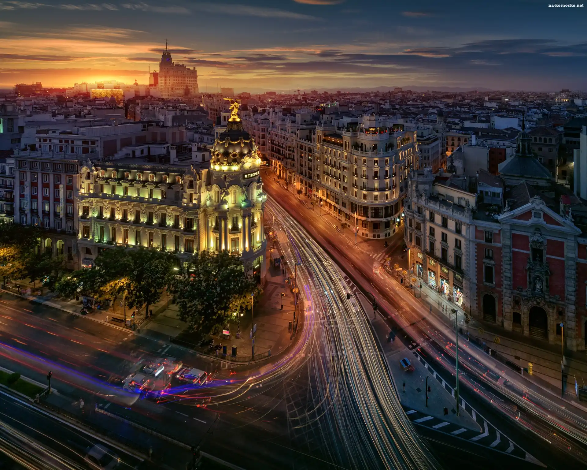 Miasto nocą, Madryt, Hiszpania, Domy, Biurowiec Metrópolis, Droga na Komórkę