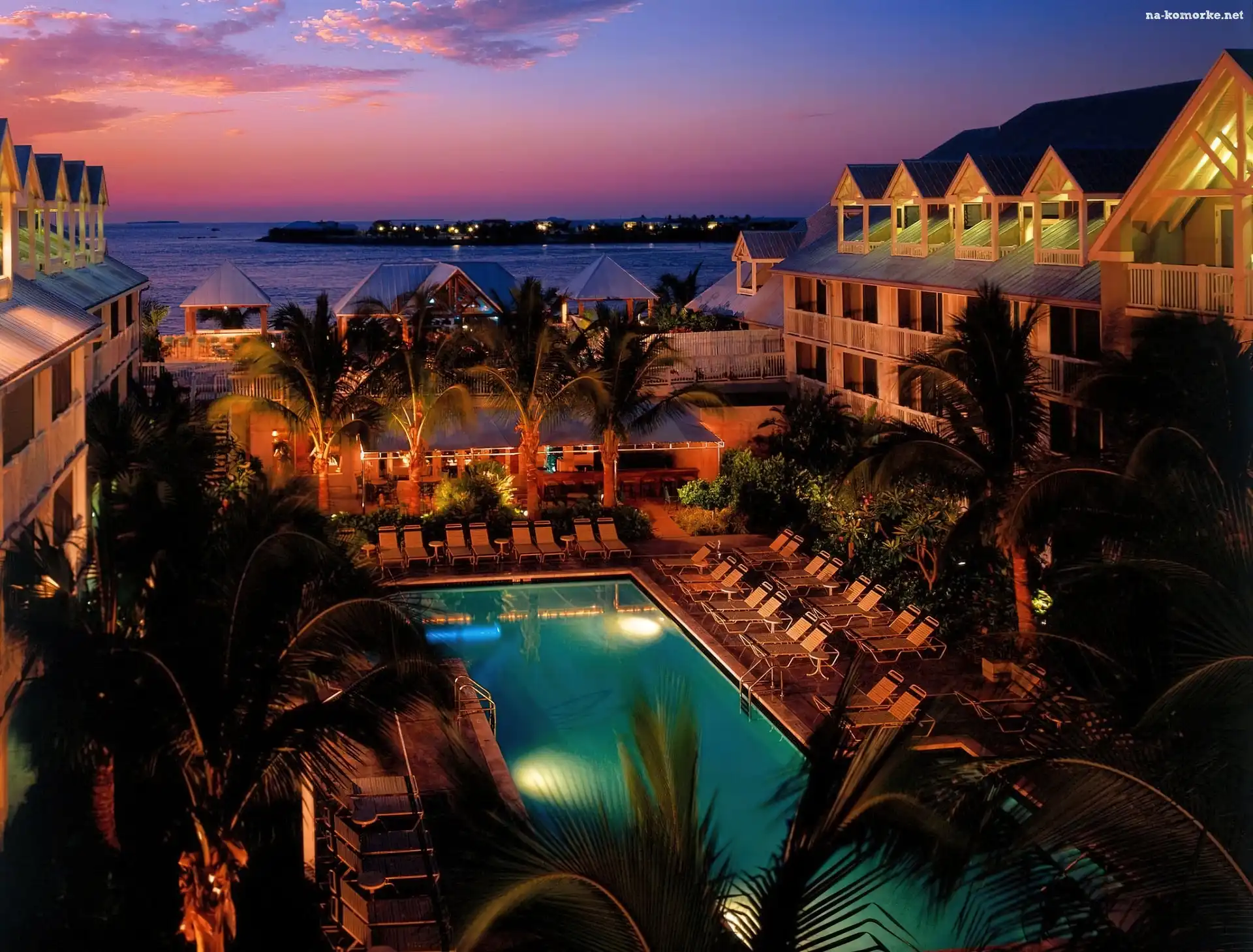 Nocą, Hotel, Basen, Morze, Palmy na Komórkę
