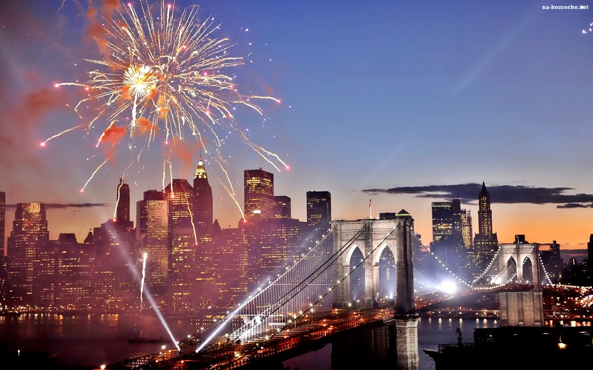 Rzeka, Nocą, Miasta, Fajerwerki, Most, Drapacze Chmur na Komórkę