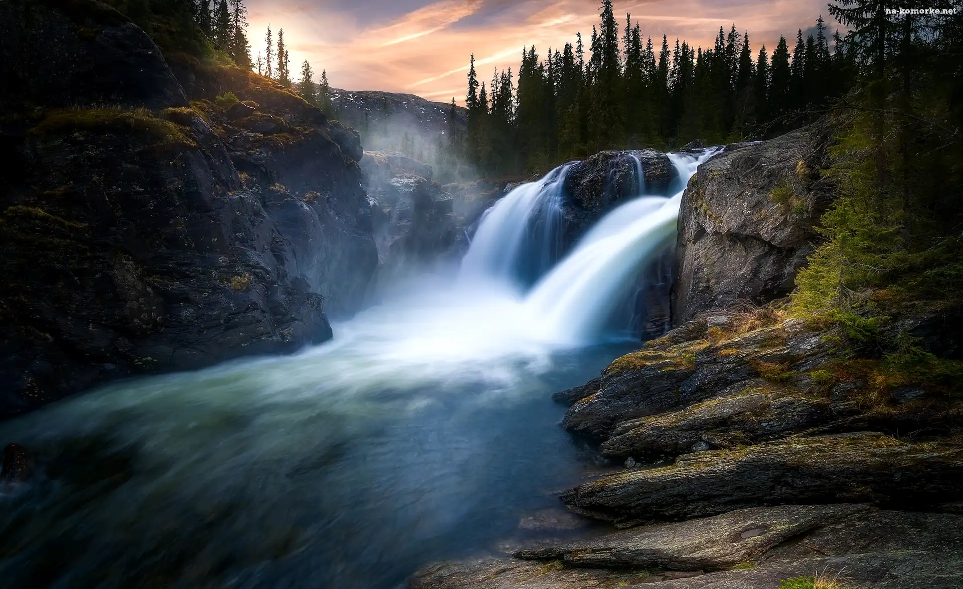Drzewa, Norwegia, Gmina Hemsedal, Wodospad Rjukandefossen, Skały na Komórkę