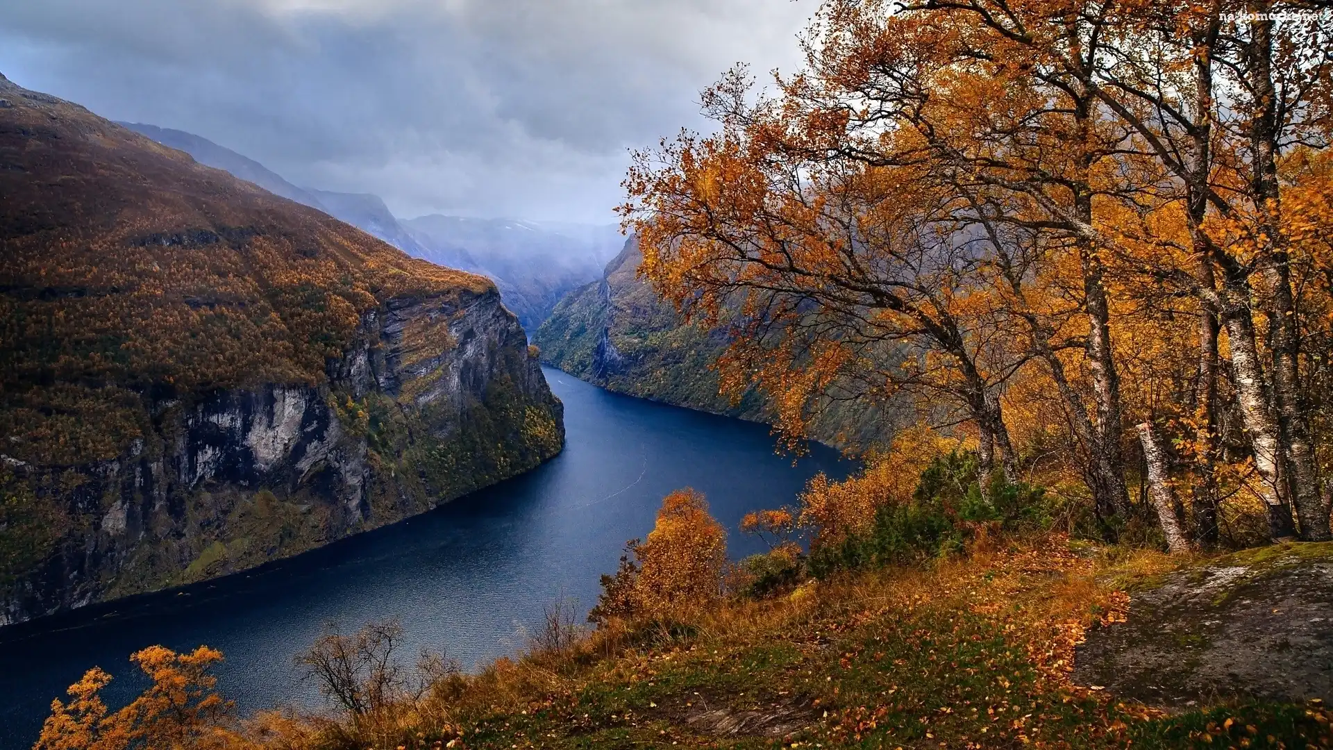 Norwegia, Góry, Fiord Geirangerfjorden, Jesień, Drzewa na Komórkę