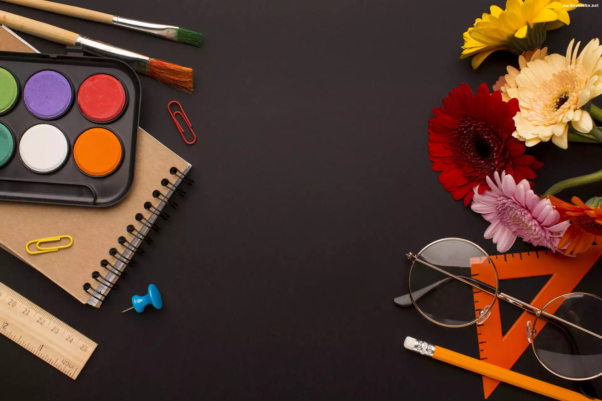 Szkolne, Linijka, Notatnik, Farbki, Ekierka, Kolorowe, Okulary, Pędzle, Ołówek, Kwiaty, Gerbery na Komórkę |