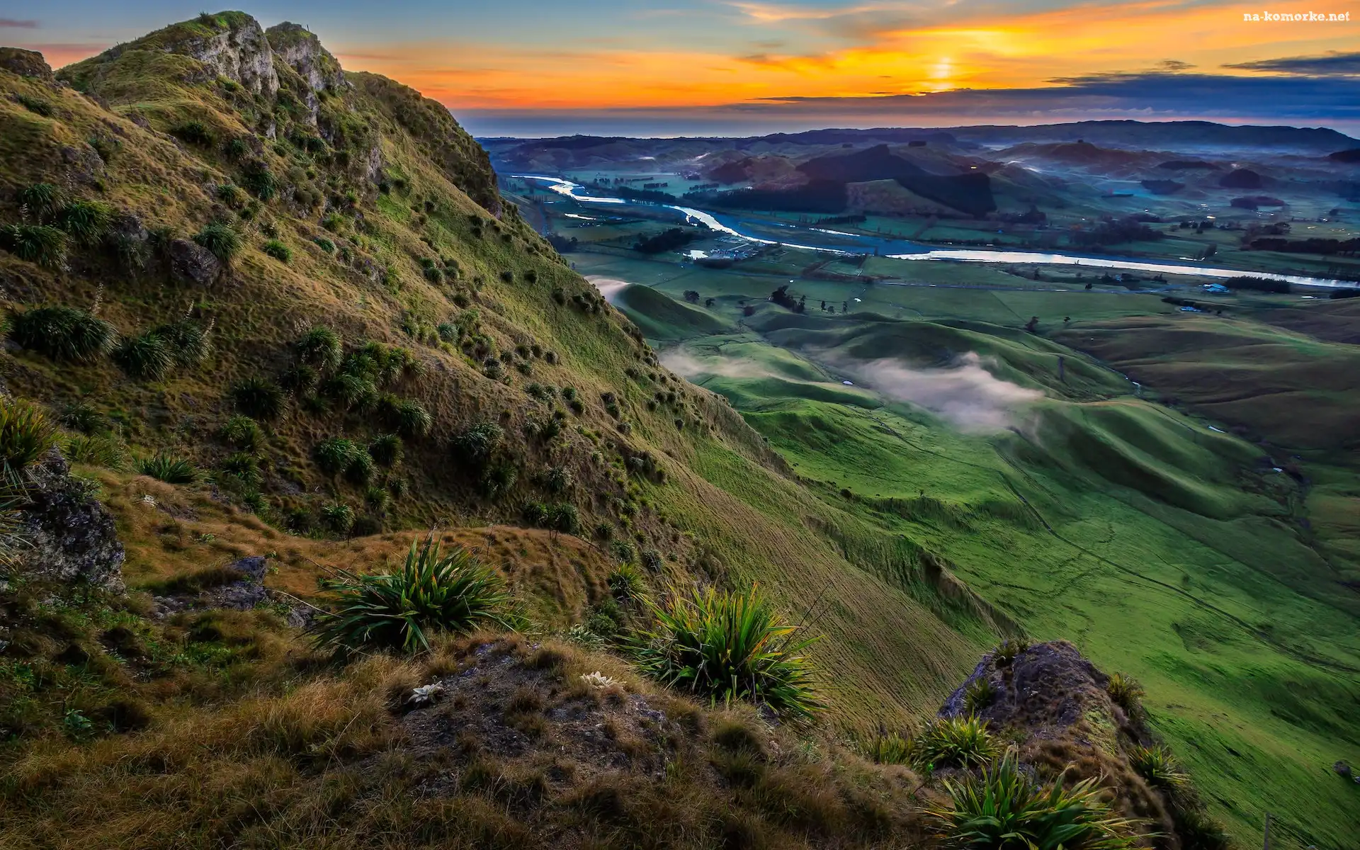 Nowa Zelandia, Wschód słońca, Rzeka Tukituki River, Dolina, Region Hawkes Bay, Góry Te Mata Peak, Wzgórza, Góry na Komórkę |