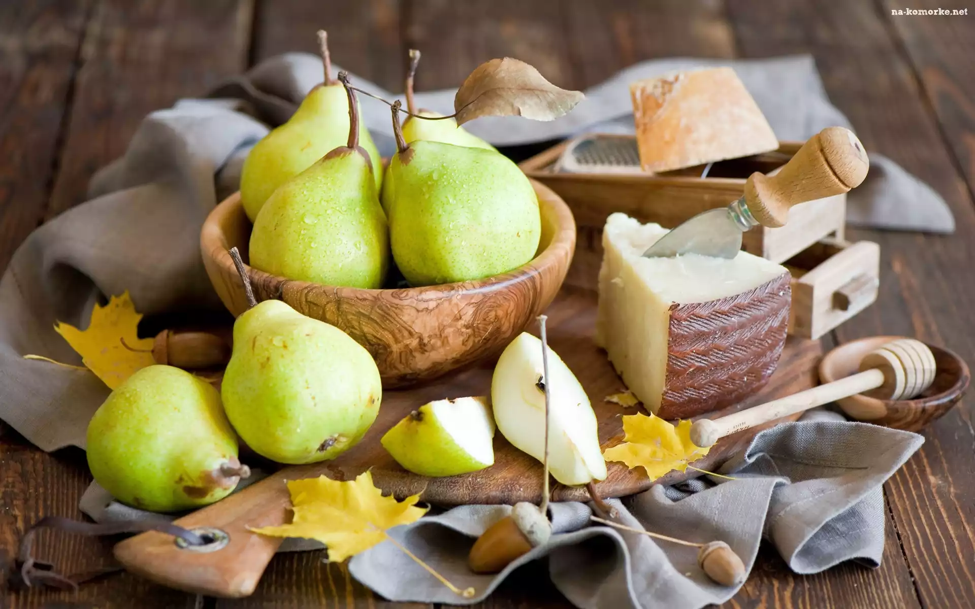 Kompozycja, Nóż, Liście, Gruszki, Ser, Miska, Deska na Komórkę