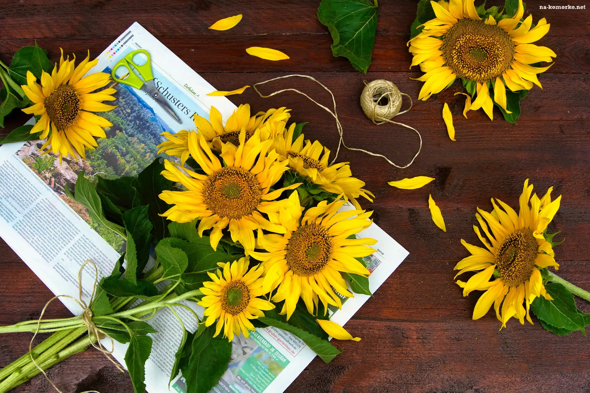 Kwiaty, Nożyczki, Słoneczniki, Kompozycja, Bukiet, Gazeta, Dekoracja, Sznurek na Komórkę