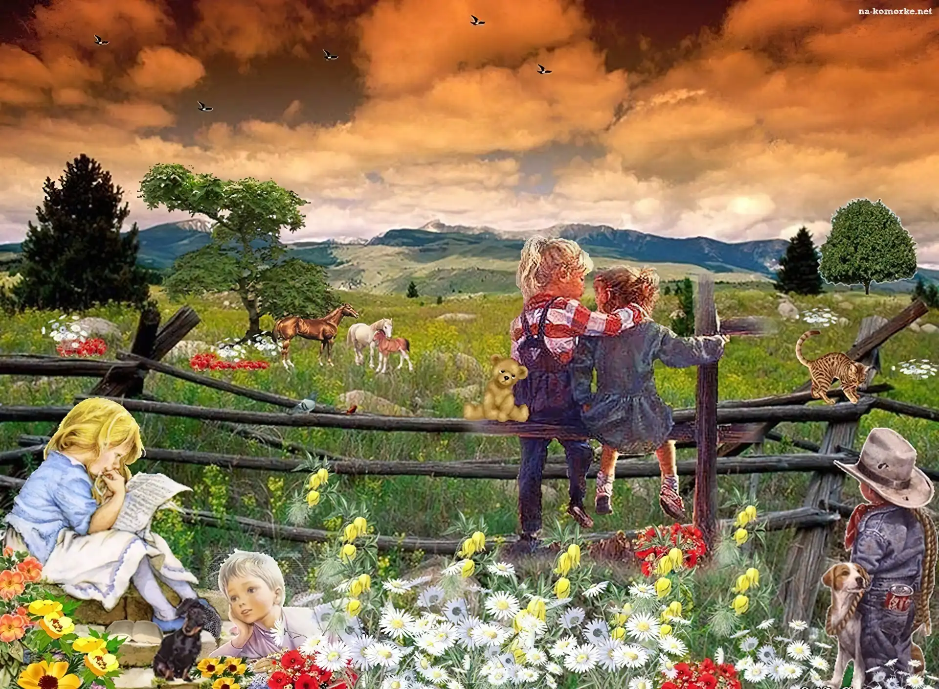 Obraz, Dzieci, Łąka, Kwiaty, Zwierzęta na Komórkę