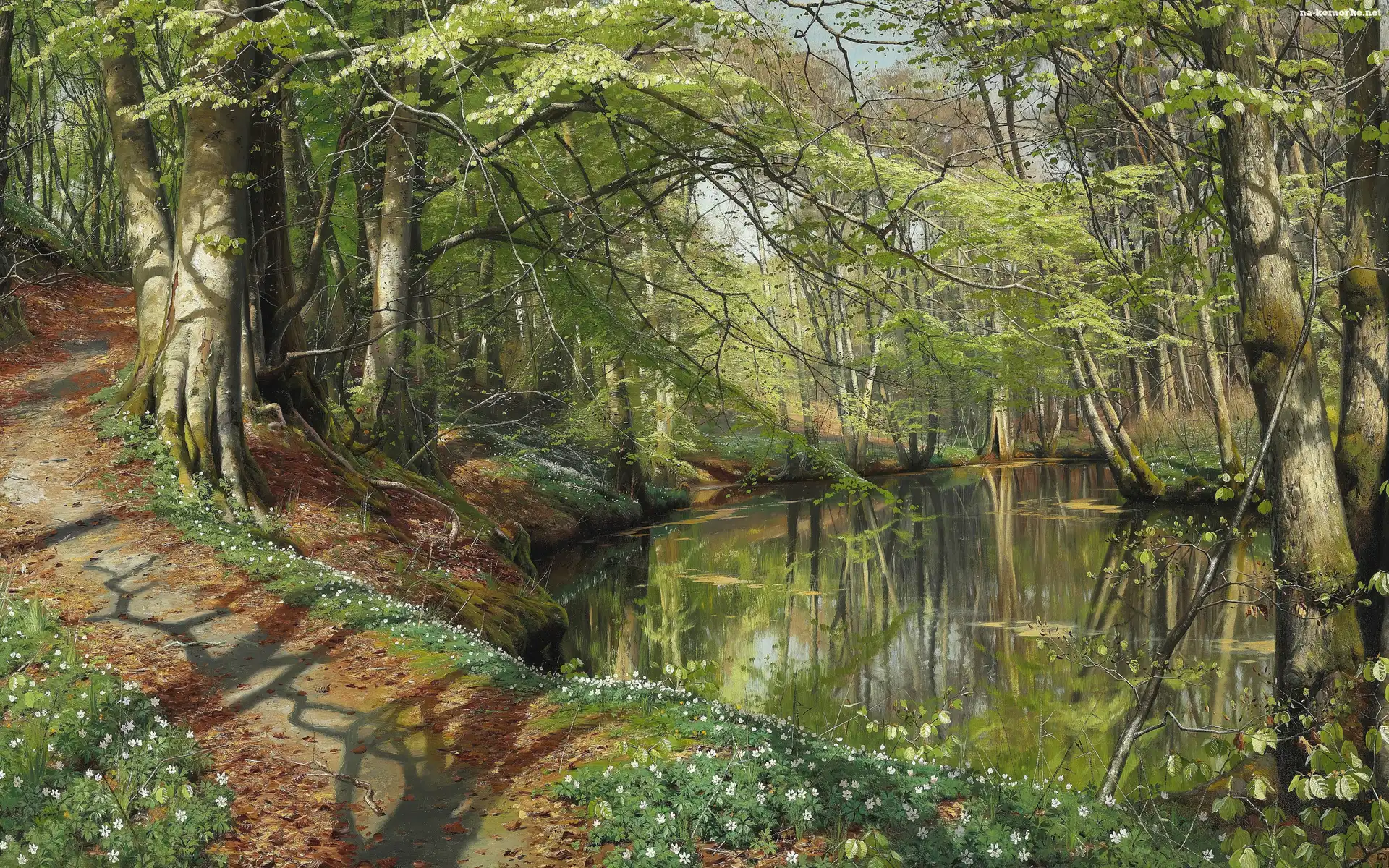 Obraz, Rzeka, Wiosna, Malarstwo, Peder Mork Monsted, Drzewa, Zawilce, Pejzaż, Droga, Las, Kwiaty na Komórkę |