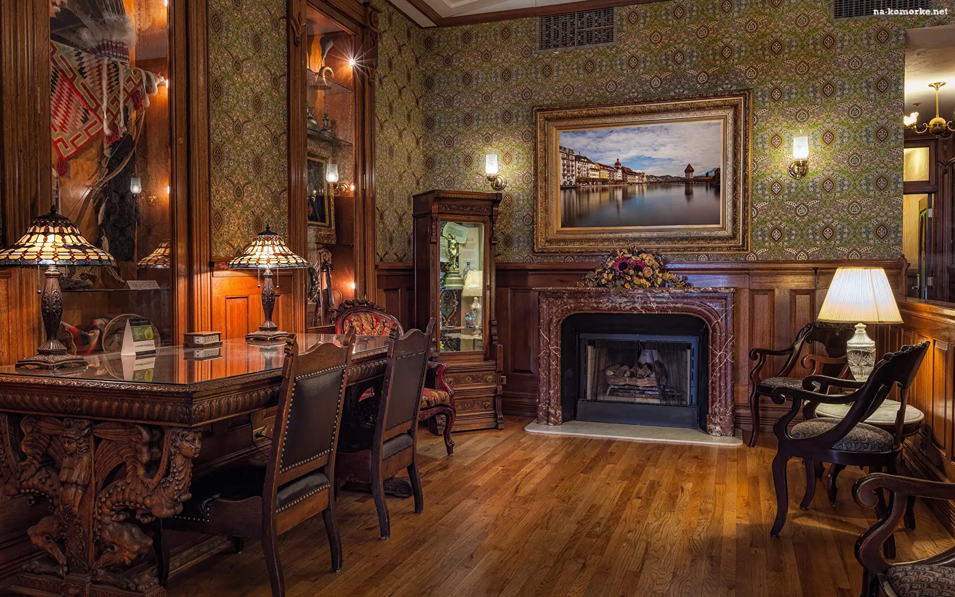 Lampy, Pokój, Kominek, Obraz, Krzesła, Stół na Komórkę