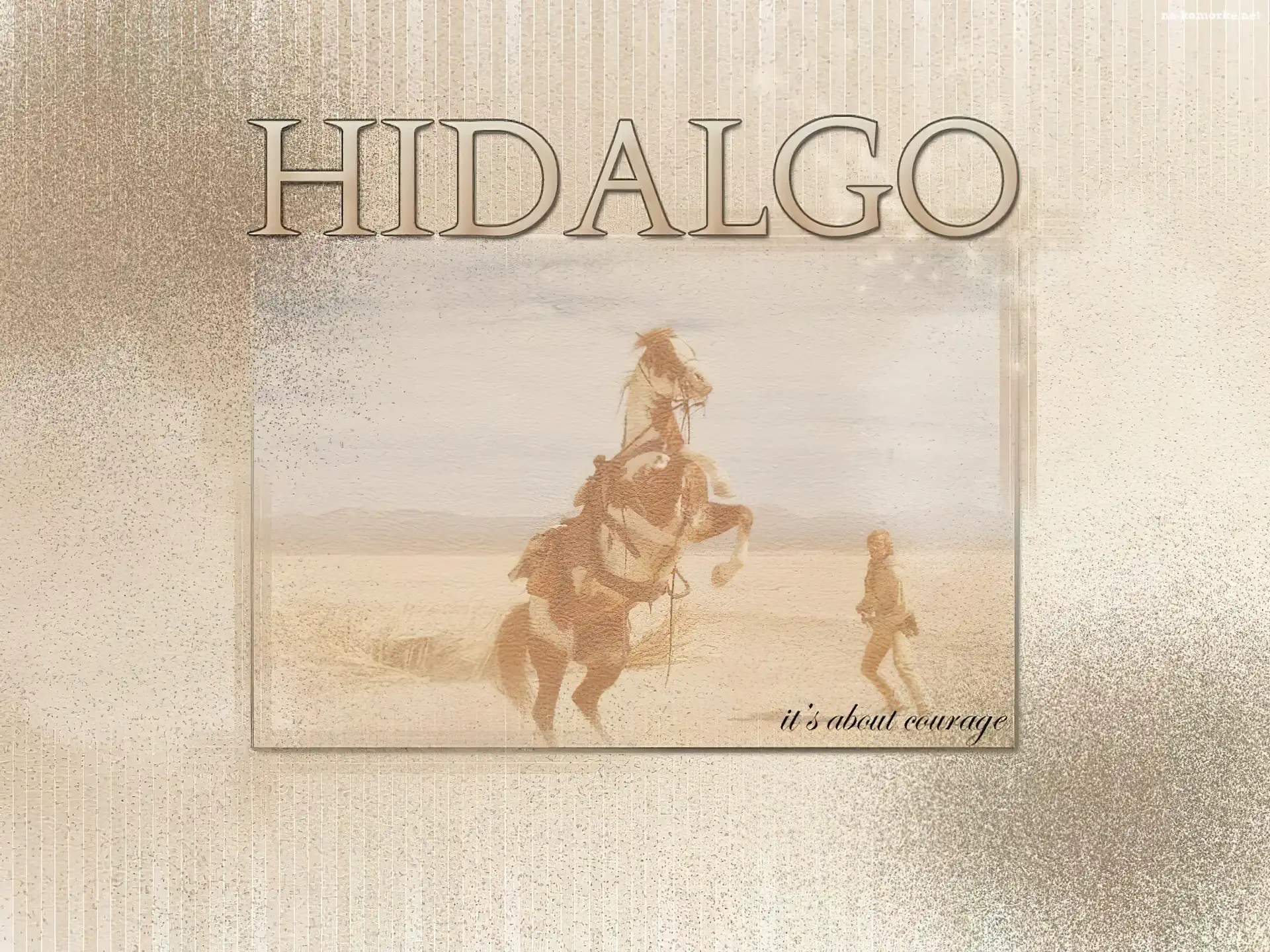 Hidalgo, pustynia, człowiek, koń Hidalgo, obrazek, koń Hidalgo, kowboj, napis