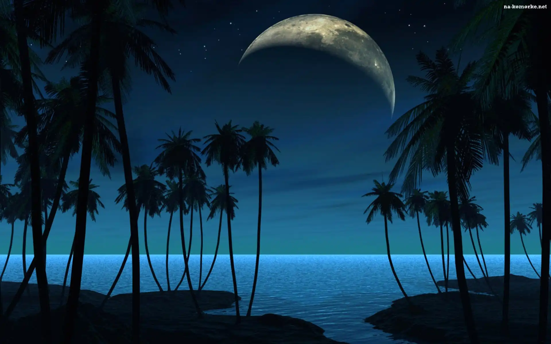 Noc, Ocean, Niebo, Fantasy, Ciemne, Księżyc, Gwiazdy, Palmy na Komórkę