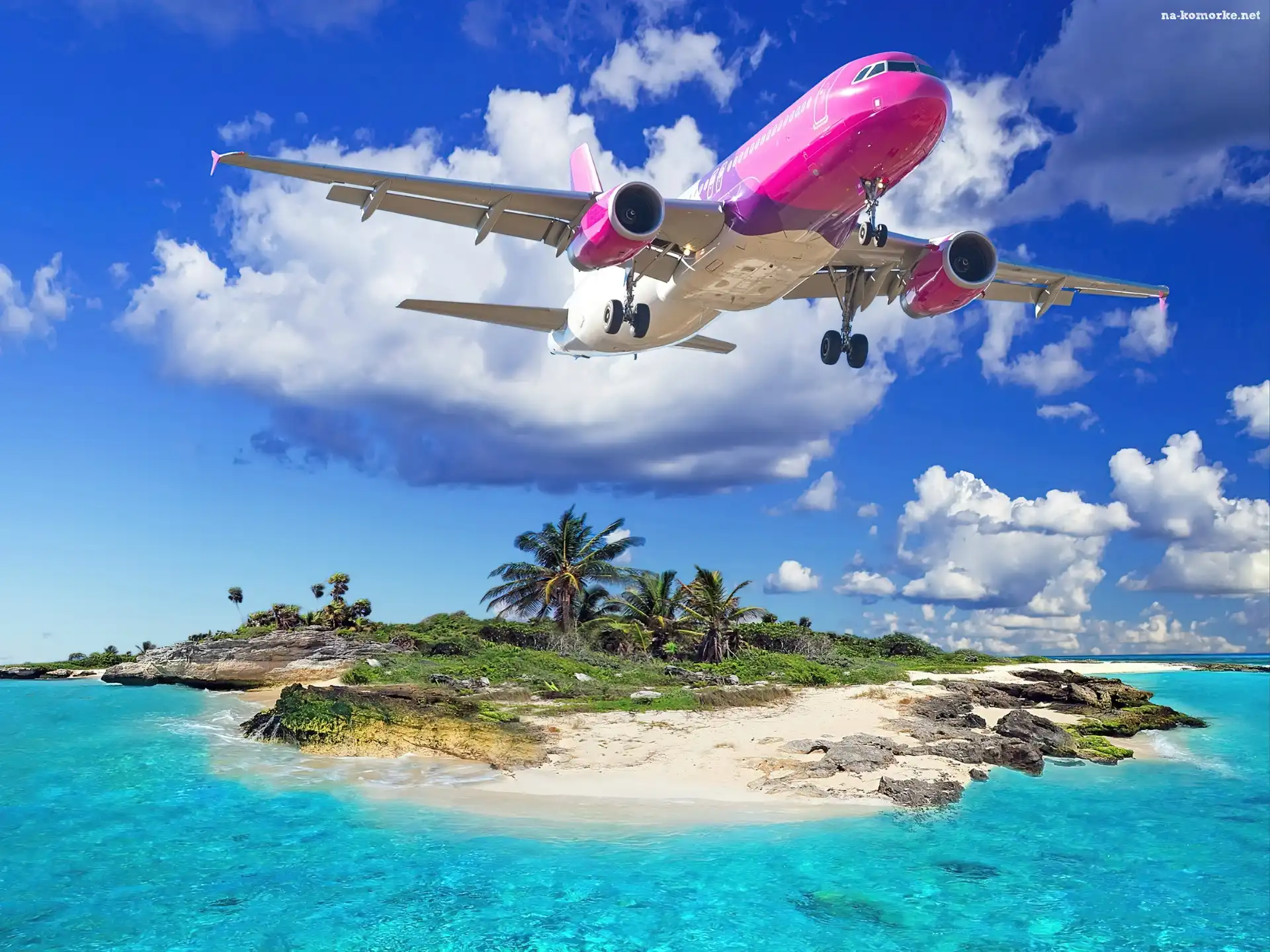 Ocean, Wysepka, Palmy, Skały, Samolot na Komórkę